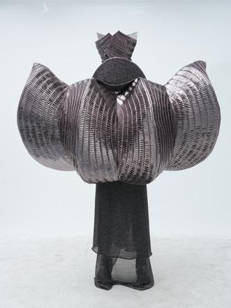 To mimic the appearance of armor and to symbolize the power our goddess holds, I used vegan sliver leather — known for its sustainability and for being cruelty free — to create spiraling detailed pleats shown on the dress. Silver, on another note, represents all medical and surgical equipment utilized in our fight against the pandemic. The back of the dress parallels the double helix structure of "DNA," the building block of each and every living organism on this Earth and the avant-garde structure of Taiwan's very own Agora Garden. Finally, when our goddess' arms are outstretched, the dress opens up to form wings, a lasting symbol of divinity and spirituality.