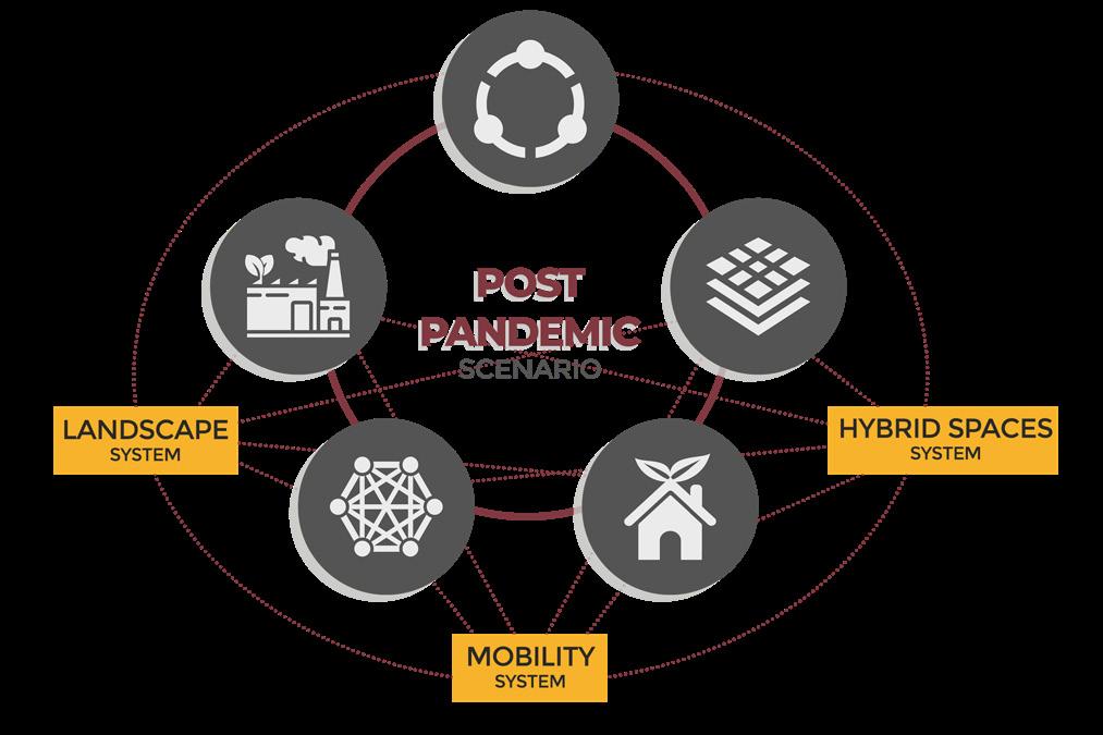 The Post-Pandemic Scenario is framed using strategic approaches including Collaboration through Clusters, Regeneration of abandoned sites, Versatility of spatial areas, Interconnection of transportation and public spaces and lastly, Self-sufficiency, independent production of energy and resources within the city.