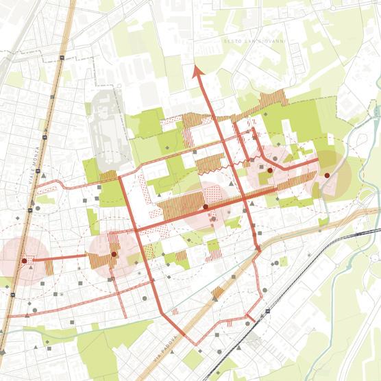 The network shall establish a more intricate network of the local centers and squares on the northern metropolitan scale through slow mobility streets prioritizing bicycle and public transport over cars and create horizontal connections within the territory. This network will be the guiding lines for future upgrading or development processes.