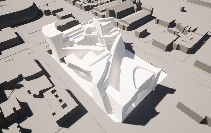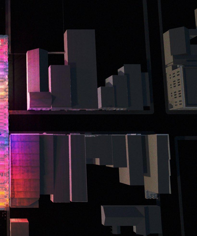 This Residential and Multipurpose Building is located in Cincinnati, OH. Included in this city block are resturants, community gardens, a plaza, and multi use classrooms. The Bridge is a place to physically connect the community through its programs and multiple bridges. The main form is created through a process using surface, object, and vector which occupy both positive and negative space in the x, y, and z cooridinates. The traditonal spatial relationships concerning top, bottom and side are broken which allow opportunities to develop moments of spatial and compositional resolution at a global scale; following a logic which allows for flexibility and problem solving at a local level. Below is the beginning process of the built site.