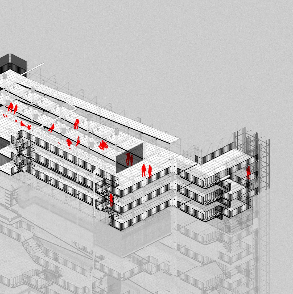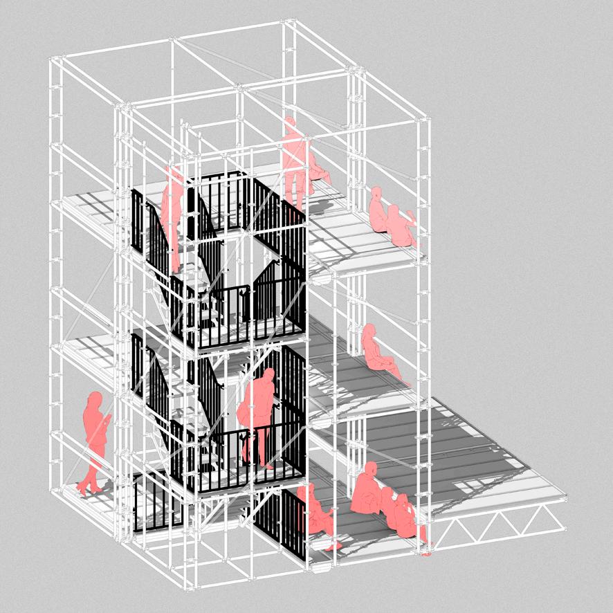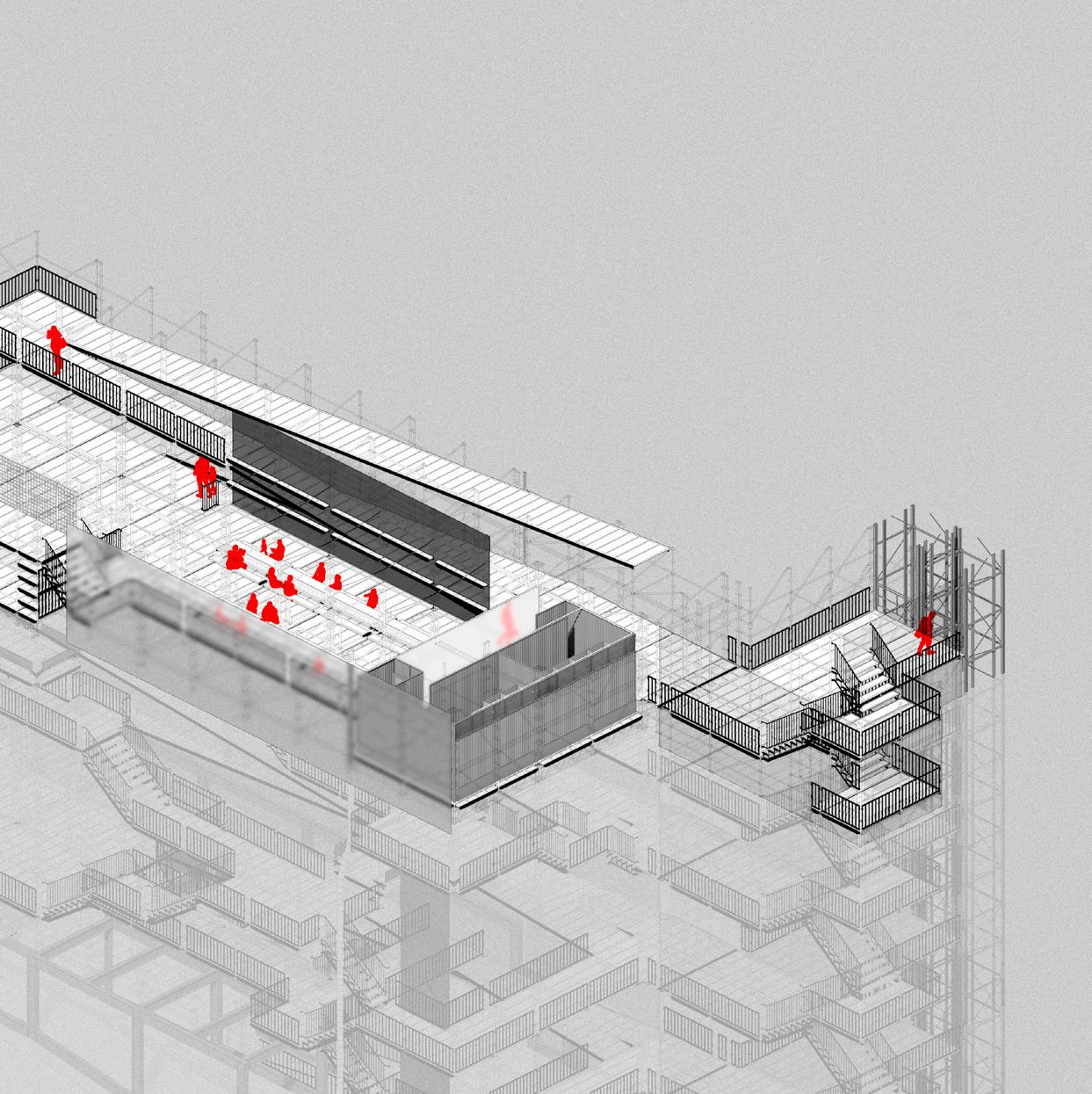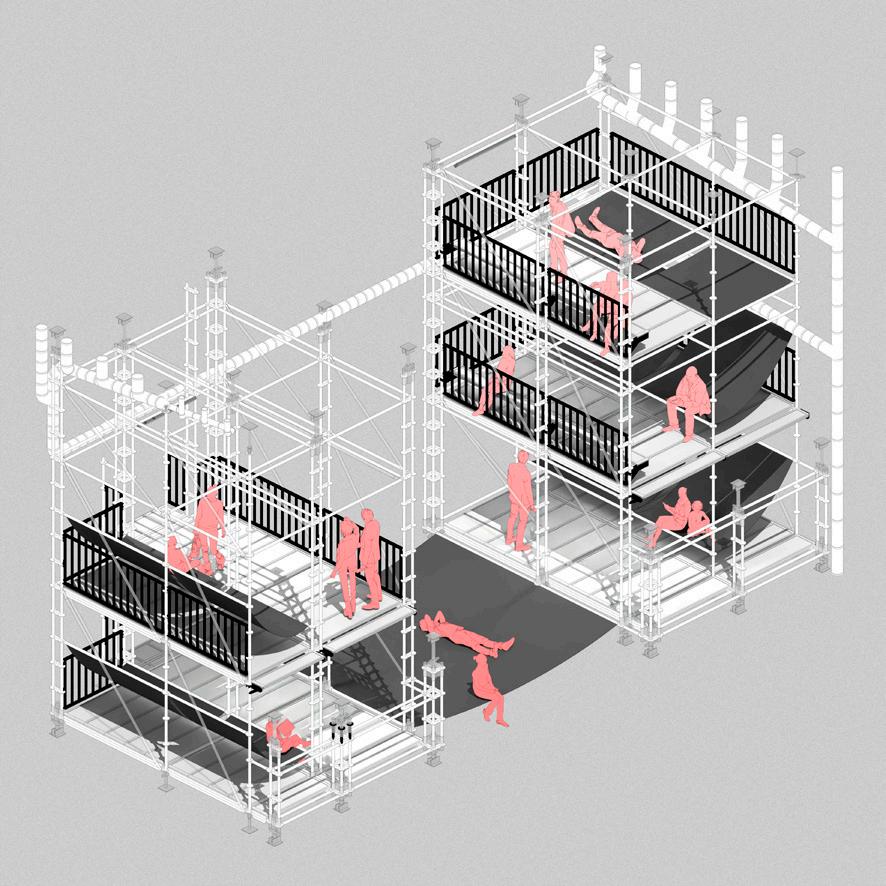 Elegendo São Paulo como seu objeto de estudo, cidade a qual abriga várias das discussões realizadas nos capítulos anteriores, a estrutura explora os espaços urbanos que a definem, não os seus edifícios históricos e consolidados, mas as empenas cegas, os lotes vazios, os estacionamentos e as coberturas de edifícios que verdadeiramente compõem a paisagem da cidade. Efêmera, a estrutura aceita que o seu destino é acabar, porém confiante que a sua breve passagem será capaz de deixar marcas. Marcas essas invisíveis, correspondentes às memórias das atividades lá realizadas. Uma arquitetura criada coletivamente, que reconhece ser apenas o suporte para as ações das pessoas, essas sim as quais serão verdadeiramente responsáveis por impactar o futuro da cidade existente. Uma nova ocupação contra o novo normal anunciado.