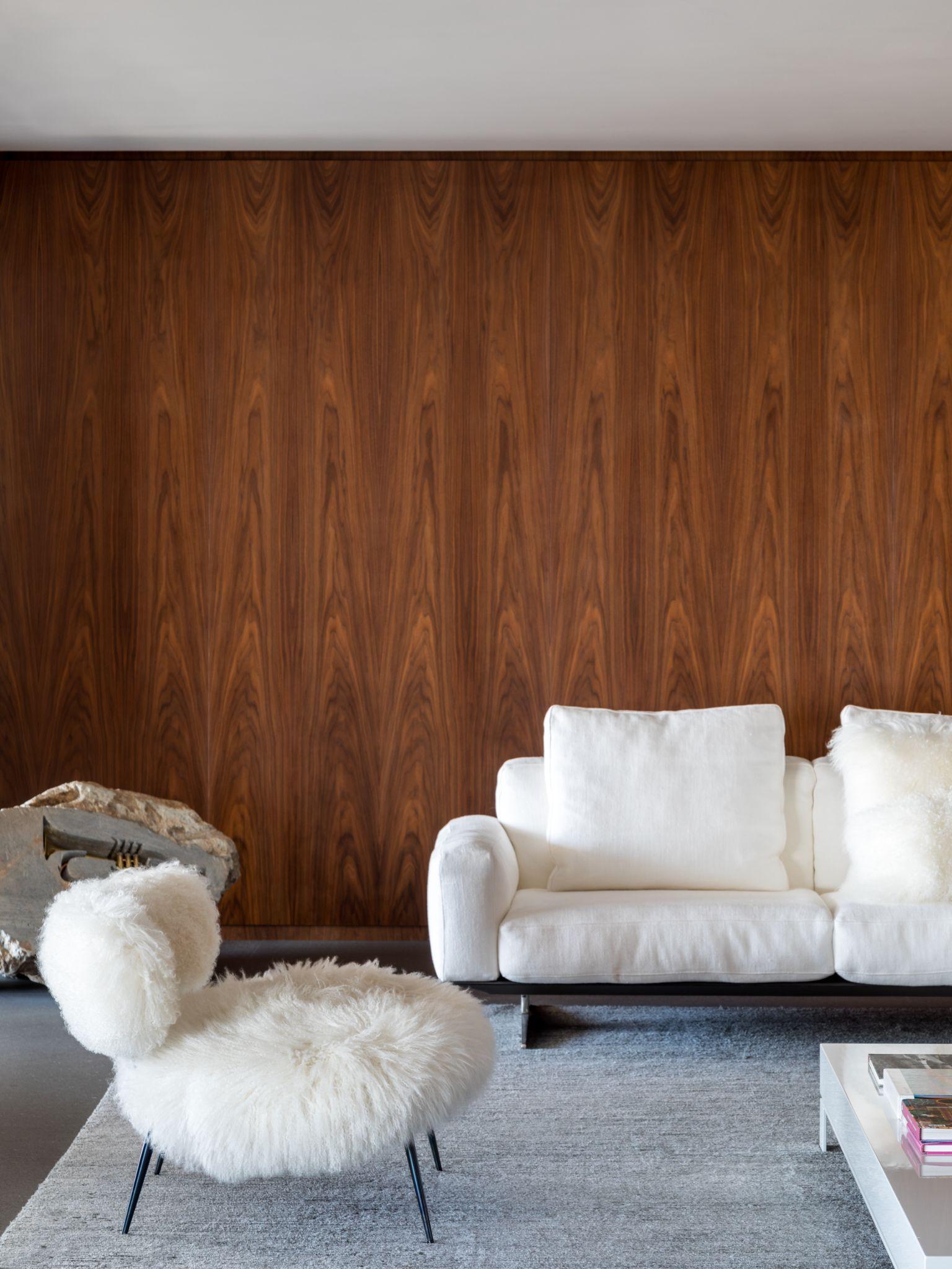 Dando unidade às áreas sociais e íntimas do apartamento, o projeto fez uso do revestimento em madeira para as paredes da área de estar e para detalhes do mobiliário nos dormitórios. Os demais materiais escolhidos acompanham a divisão funcional do apartamento.Além disso, o traço mais característico do projeto é a seleção do mobiliário moderno brasileiro e das obras de arte que animam os espaços com cores fortes.