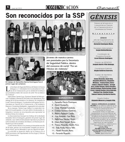 diseño gráfico: Alejandra Meneses y Joaquín Félix. GÉNesis, eXPResióN de los Nuevos vAloRes es un esfuerzo editorial de los estudiantes de la licenciatura en ciencias de la comunicación de la universidad de sonora. el presente medio es elaborado íntegramente en el Área editorial del departamento de Psicom e impreso en los talleres de editorial el auténtico. agradecemos los apoyos de la división de ciencias sociales y de la Jefatura de Psicom de la unison para la elaboración de este ejemplar. cualquier comentario o colaboración le solicitamos lo haga llegar al e-mail y blog: jfelix@sociales.uson.mx periodicogenesis.blogspot.com Facebook: Periódico génesis Twitter: @genesisunison