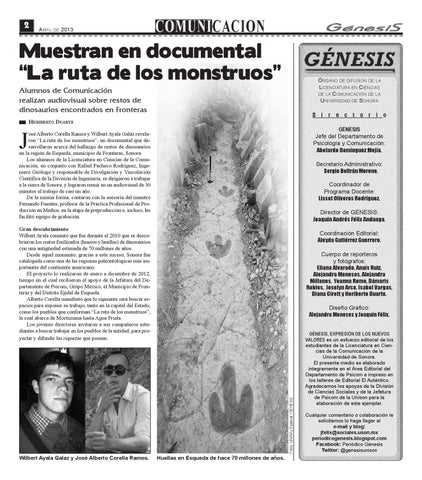 GÉNesis, eXPResióN de los Nuevos vAloRes es un esfuerzo editorial de los estudiantes de la licenciatura en ciencias de la comunicación de la universidad de sonora. el presente medio es elaborado íntegramente en el Área editorial del departamento de Psicom e impreso en los talleres de editorial el auténtico. agradecemos los apoyos de la división de ciencias sociales y de la Jefatura de Psicom de la unison para la elaboración de este ejemplar. cualquier comentario o colaboración le solicitamos lo haga llegar al e-mail y blog: jfelix@sociales.uson.mx periodicogenesis.blogspot.com Facebook: Periódico génesis Twitter: @genesisunison