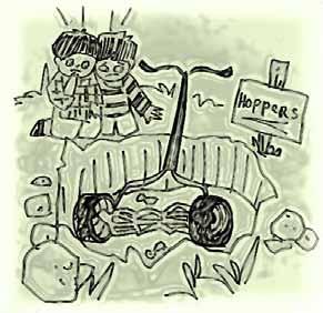 Diego and Carlitos did not waste any time mourning the death of the foxhole because they now had a club name, the Grasshoppers t he Hoppers (the code name for the club) had to hop to another hideout. t he boys’ mission had turned into finding another hideout. Carlitos had a private hideout that only his mother knew about, but he would wait another ten months before he would share his secret with Diego. They filled the days that followed with planning and writing up case files: some that had bank robbers, others--Robin Hood-type characters--stealing from the rich and giving to the poor. the boys agreed they needed a safe place, but not an under ground one, ever again. Diego didn’t want to even imagine the outcome if the two of them had been in the foxhole when the mower drove over it. Diego and Carlitos wanted to find a place where they could stay up late at night, tell spy stories and plan crimes that only the Hoppers could solve. Diego usually came up with the story line and Carlos filled in the de