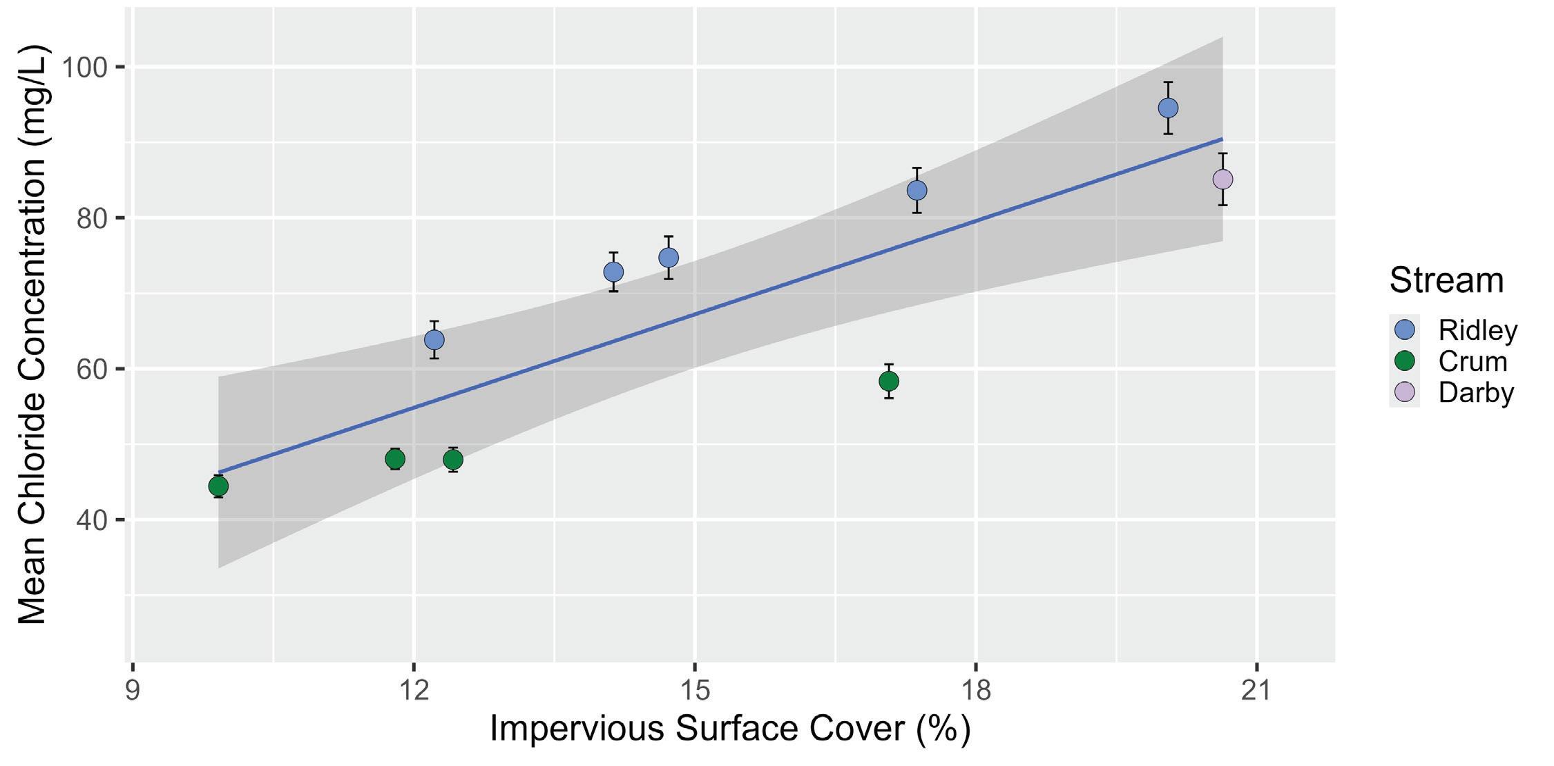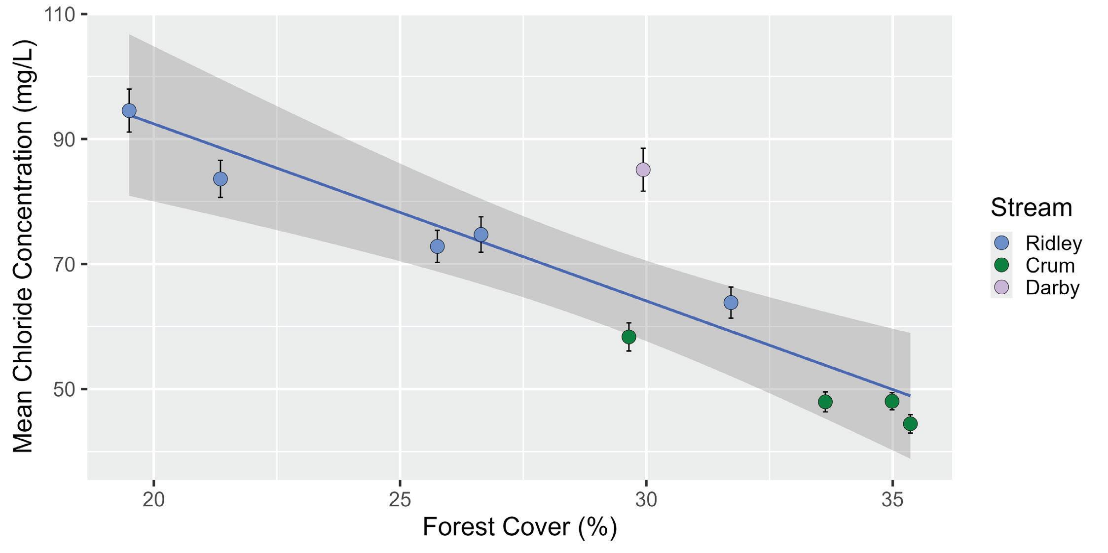 Figure 1. Relationship between land use and chloride levels in Ridley (blue), Crum (green), and Darby Creeks (purple). 1a. Chloride levels decrease as forest cover on the landscape increases across all watersheds. Fewer slippery surfaces and increased stormwater capture and filtration reduces the chloride levels at more heavily forested sites. 1b. Chloride levels increase as impervious surface, representing development, increases on the landscape. Chloride increases as a result of the application of road salts ahead of winter storms on slippery surfaces such as roads, sidewalks and driveways.