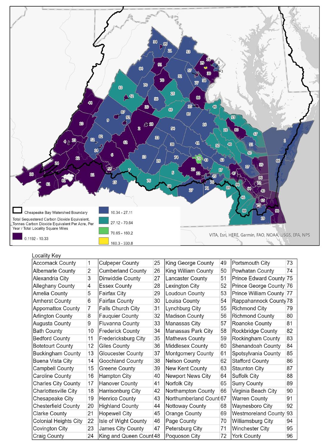 “We wanted to understand better how efforts implemented under the Chesapeake Bay Watershed Agreement to improve water quality in Virginia could also generate significant climate mitigation benefits by removing carbon from the atmosphere and storing it in vegetation or soil,” said Chesapeake Conservancy Vice President of Technology Susan Minnemeyer.
