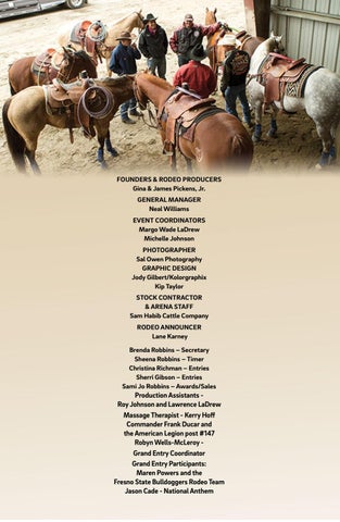 FOUNDERS & RODEO PRODUCERS Gina & James Pickens, Jr. GENERAL MANAGER Neal Williams EVENT COORDINATORS Margo Wade LaDrew Michelle Johnson PHOTOGRAPHER Sal Owen Photography GRAPHIC DESIGN Jody Gilbert/Kolorgraphix Kip Taylor STOCK CONTRACTOR & ARENA STAFF Sam Habib Cattle Company RODEO ANNOUNCER Lane Karney Brenda Robbins – Secretary Sheena Robbins – Timer Christina Richman – Entries Sherri Gibson – Entries Sami Jo Robbins – Awards/Sales