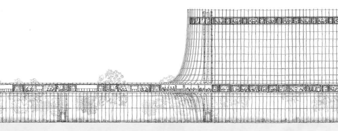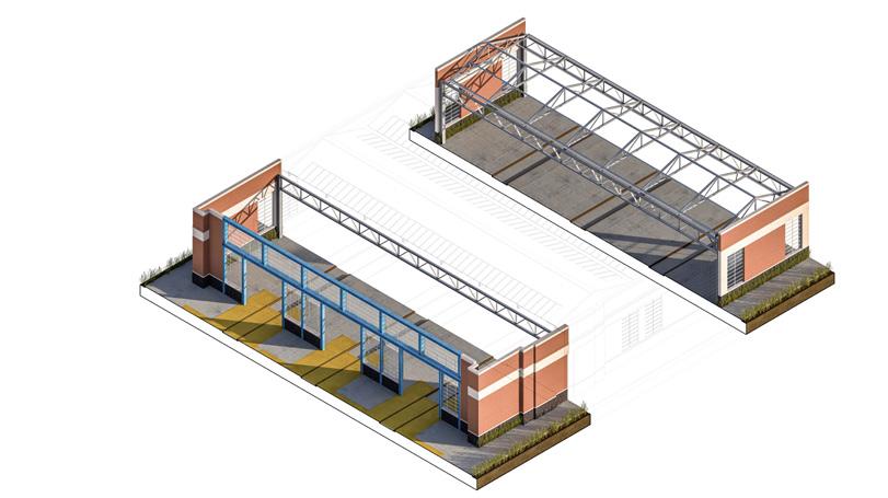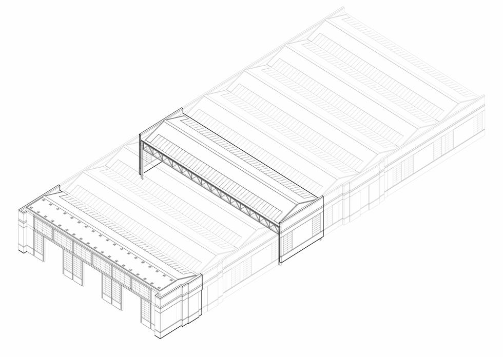 At the first stage of assessing what recycled materials would be available for reuse in my project, I carried out a detailed survey of the existing Cockfosters depot as the plans and sections were not publicly available. I then drew up the most accurate 3D model of the building so that I could calculate precisely which materials would become available and how much embodied carbon could be salvaged/saved from landfill.