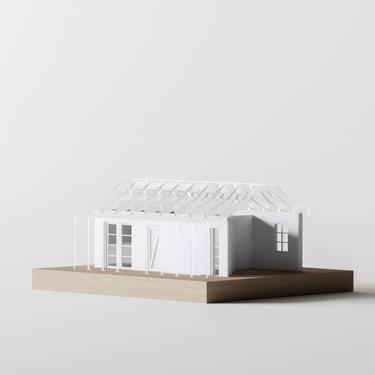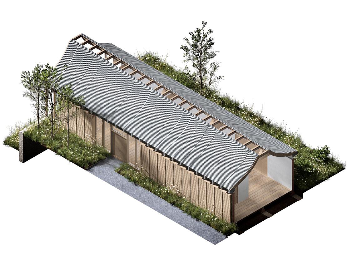 The community center is located at the south end of the site where the land meets Bramley Road. Included within the larger built body (clad in stacked timber beams and roofed with reclaimed corrugated steel sheeting) is a cafe, workspace, hall, kitchen and lobby. The spaces are designed to be purposefully open with minimal interior walls. This allows for the building to easily adapt to the differing needs of a range of occupiers.