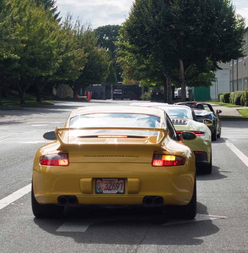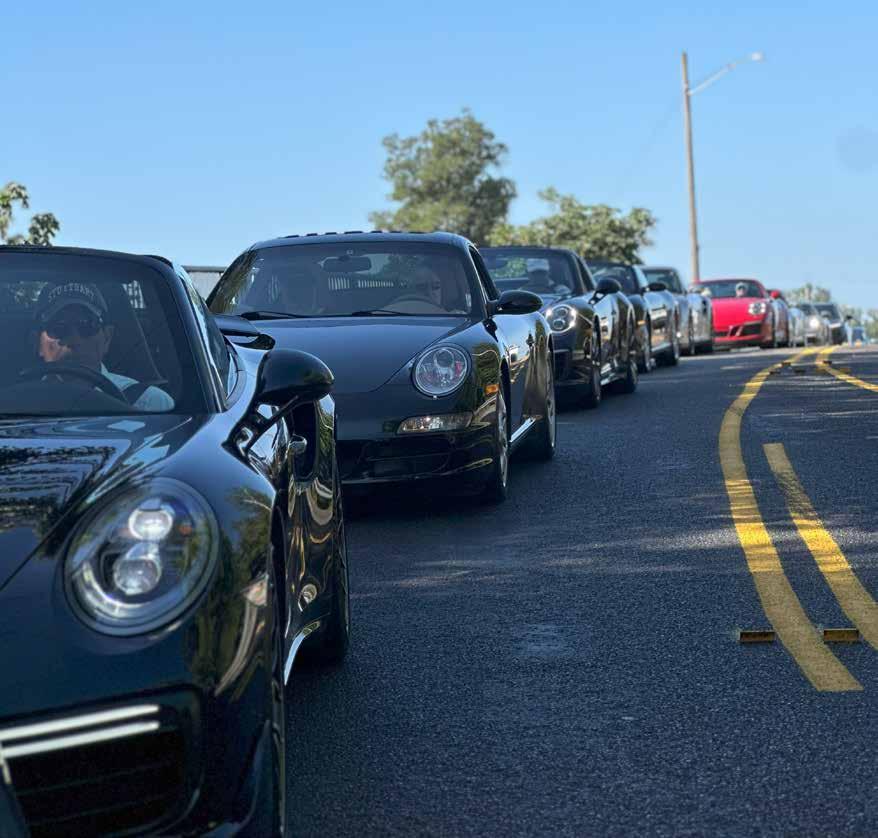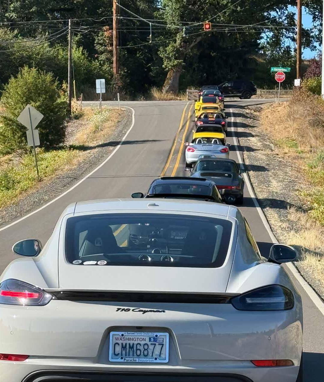Group 1 rolled out first after the safety briefing. About fifteen minutes later, Group 2 - my group - followed. Not even a full block in, we passed a teenager in a Jetta who looked like he had just seen a car parade in his own neighborhood. He was pointing excitedly at the first few Porsches, head on a swivel. Safe to say we made his morning—especially once the next ten came through behind us.