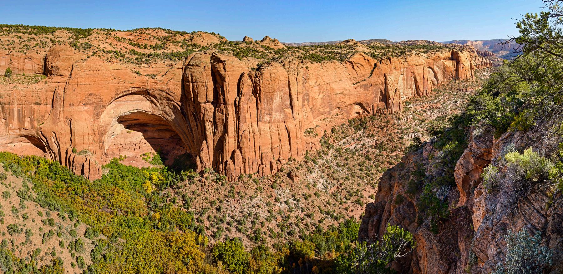 Navajo National Monument: Another panoramic image looking down canyon and across at the large ancestral cliff dwelling under the arch.