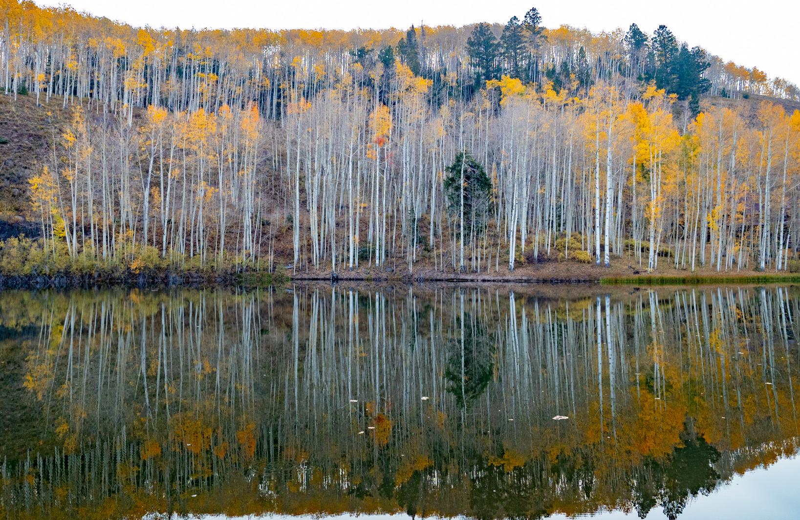 Bookmatched Aspen. "No Regrets" meant we made a number of stops on the road and turned around for a photo someone saw. This pond on the side of the road was a perfect example. © Mike Caley