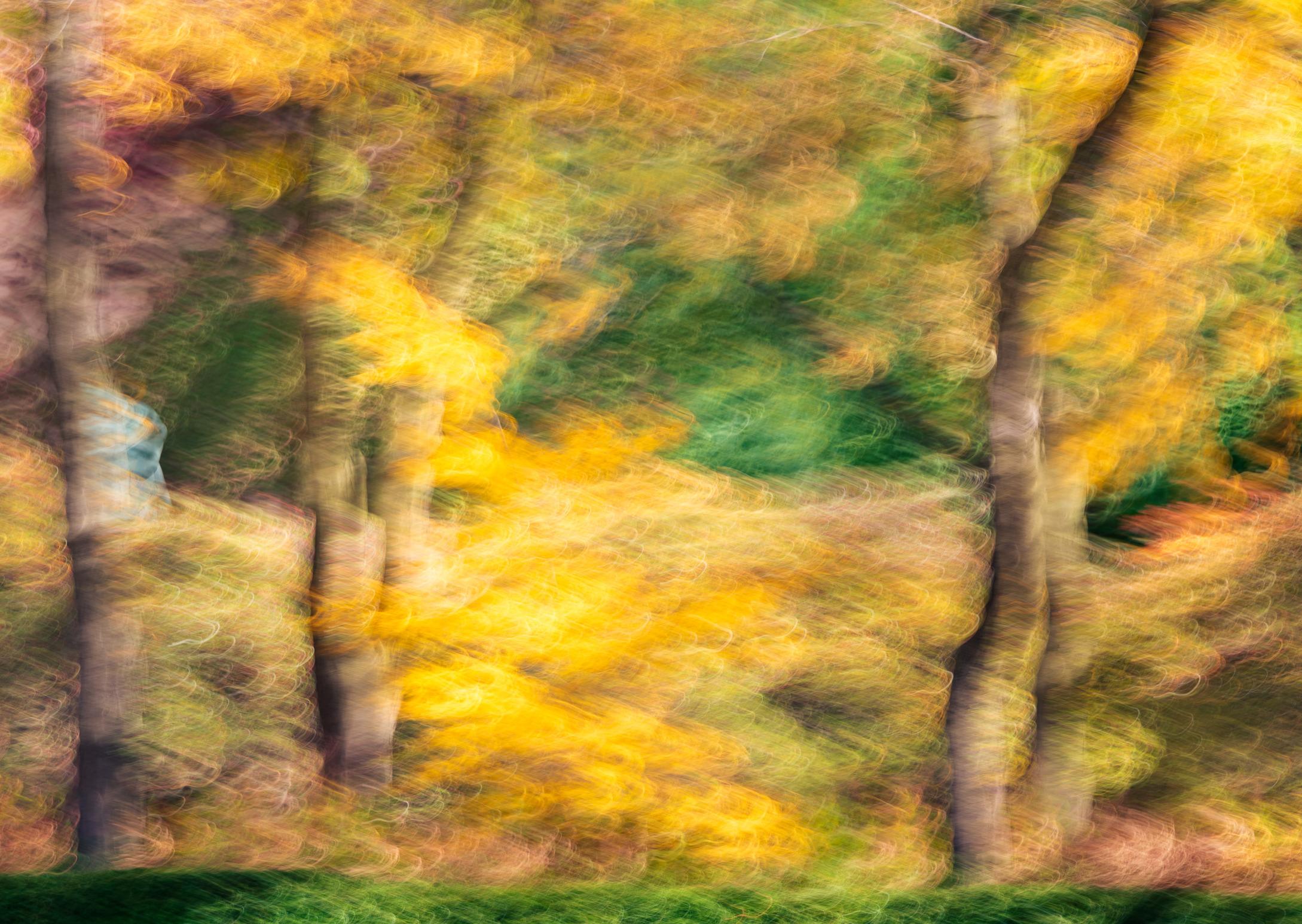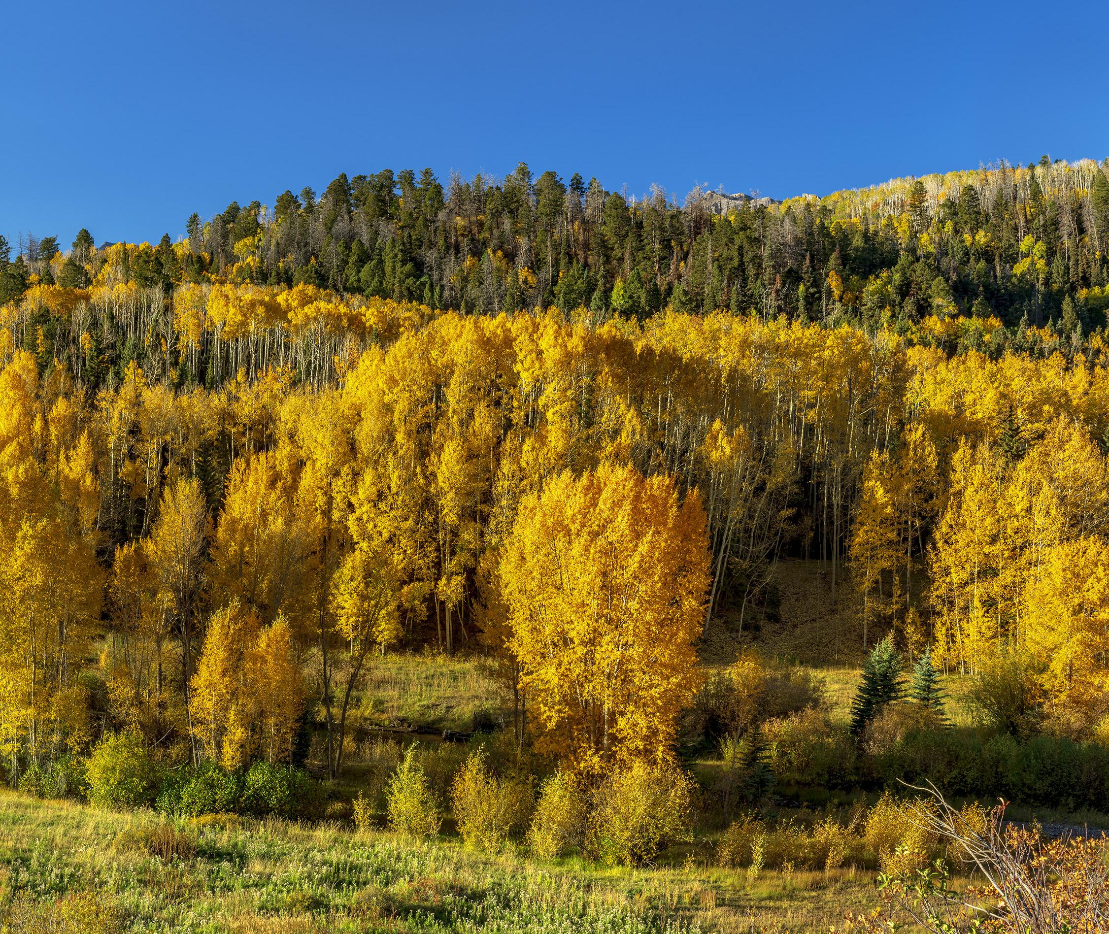 Aspen Glory. We headed up one of the county dirt roads into the mountains chasing the color. It kept getting better and better the further we drove until we came across this meadow. There was a simultaneous and unanimous "STOP". This road pretty well summed up the whole wonderful trip for all of us in Aspen Glory! © Mike Caley