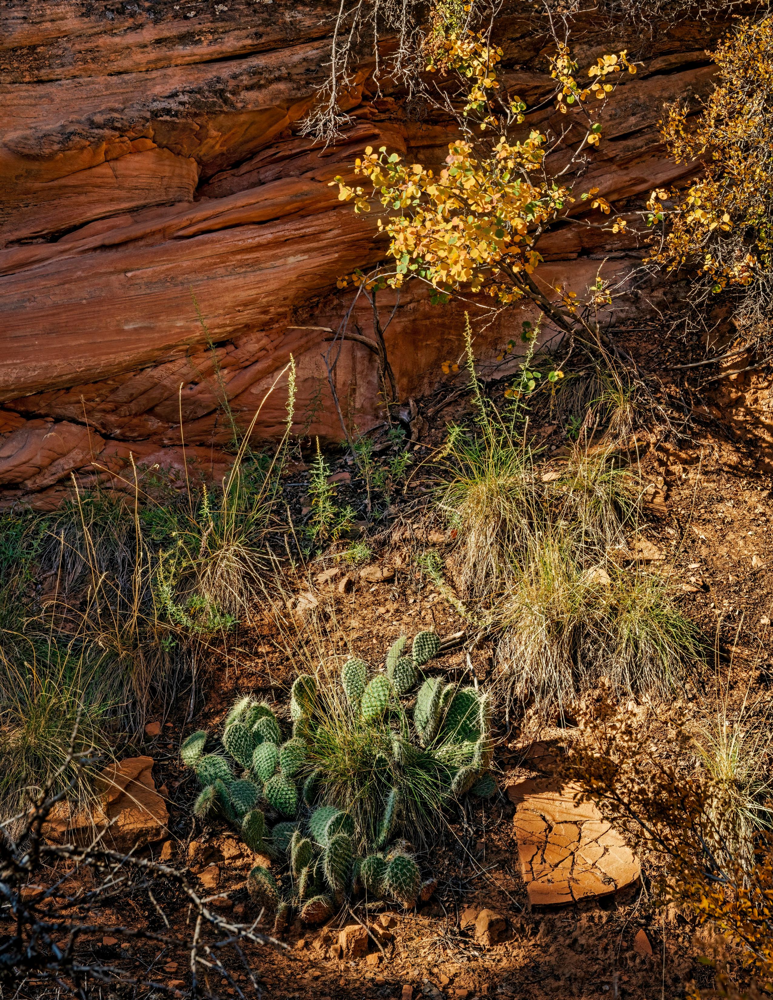 Opposite page: Cacti and Oak. Detail in a side canyon in Navajo National Monument on an autumn morning. Valley of the Gods: This is a part of Bears Ears National Monument and, in places, rivals Monument Valley.