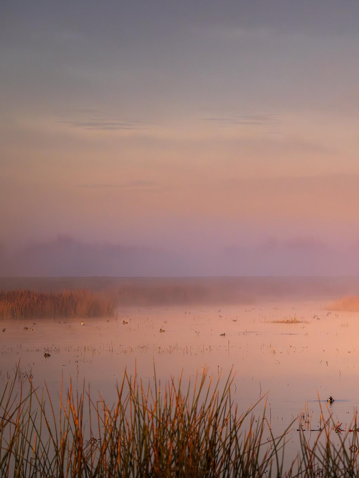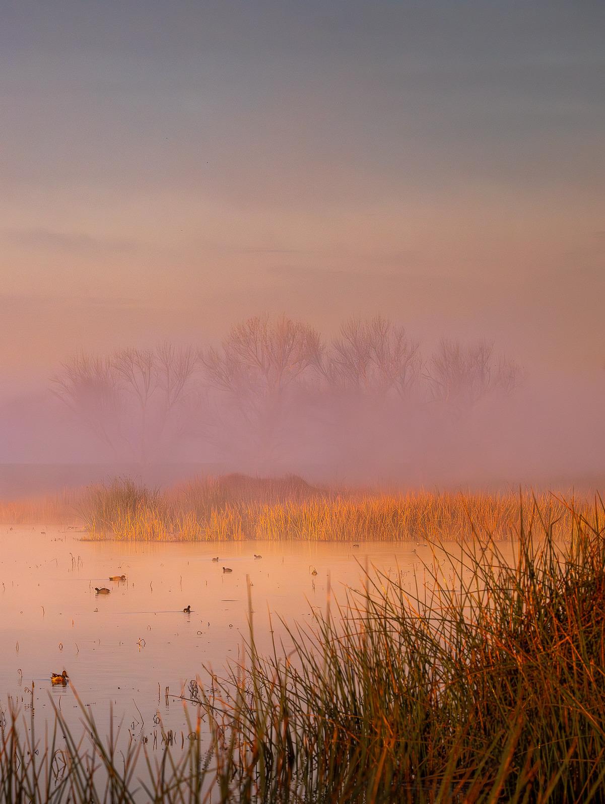 A typical late-December morning on the pond would blanketed by a heavy fog, with the rising sun adding color to the sky before appearing as an orb on the horizon. On this day the weather was unusually warm and overcast. We saw little color, but as the sky brightened the shapes on the pond began to resolve themselves, and the activity of the birds increased. A light fog rose from the pond, adding some visual drama to the scene.