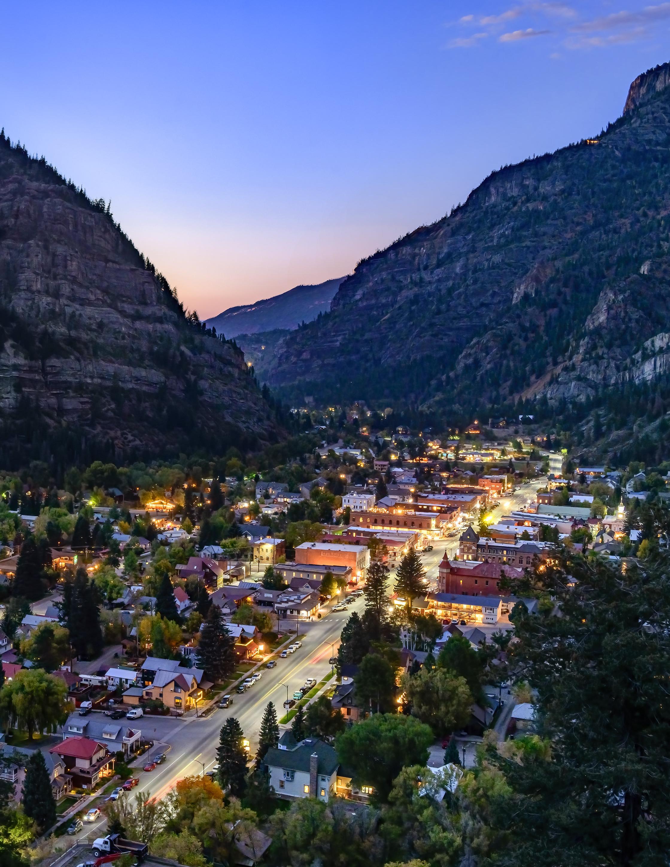 Ouray. From Highway 550 heading south out of town, a turnout provides an aerial view of Ouray, Colorado. © John Fisanotti