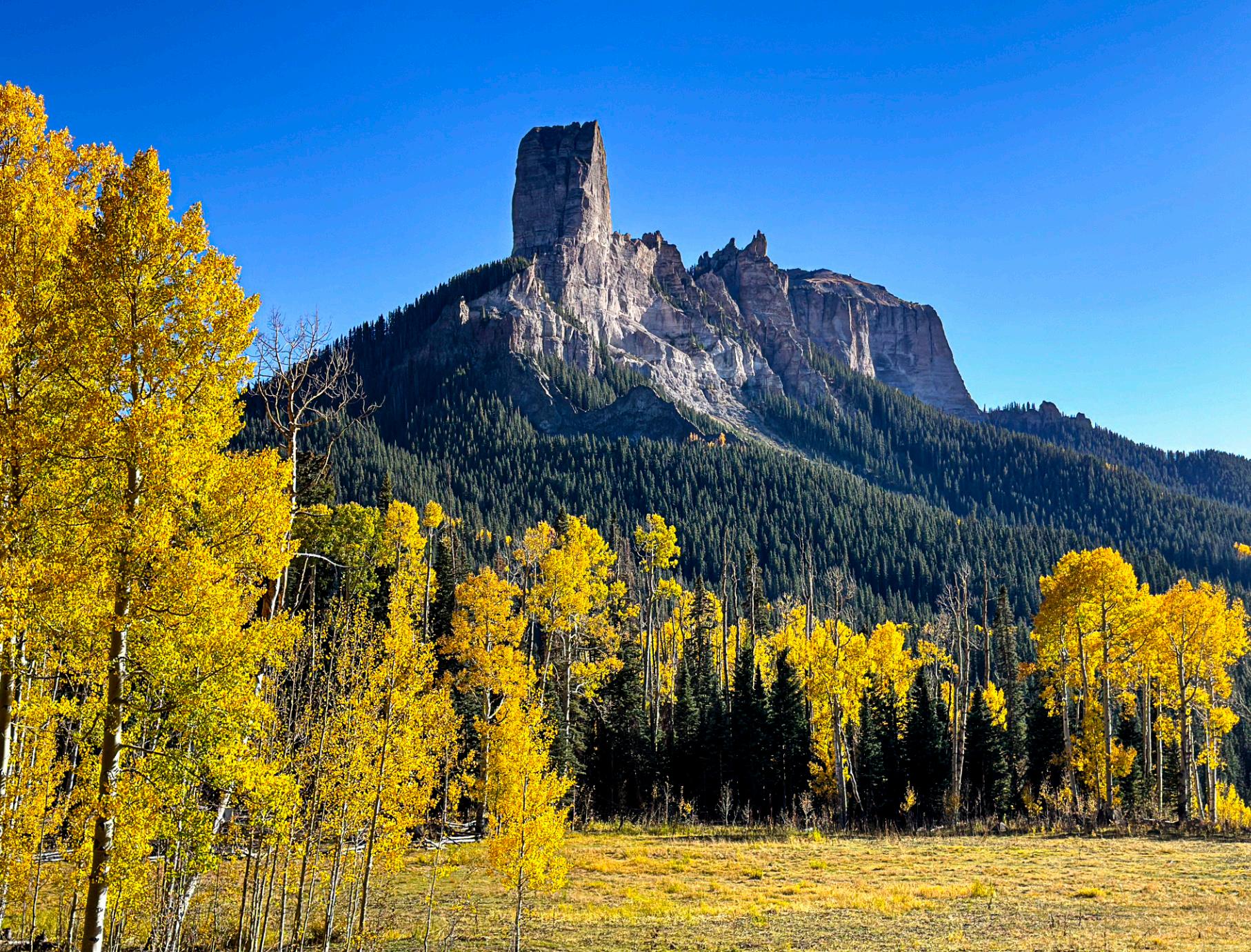 A highlight of the second day was a quick trip to Chimney Rock up Owl Creek Pass. This location has been the set for several famous western movies and offered an awesome view of the rock formation and delightful aspen meadows at its base. The entire Ouray/ Ridgway area is prominent in the John Wayne version of the movie True Grit, and the meadow below Chimney Rock is the location of the famous final gunfight on horseback.