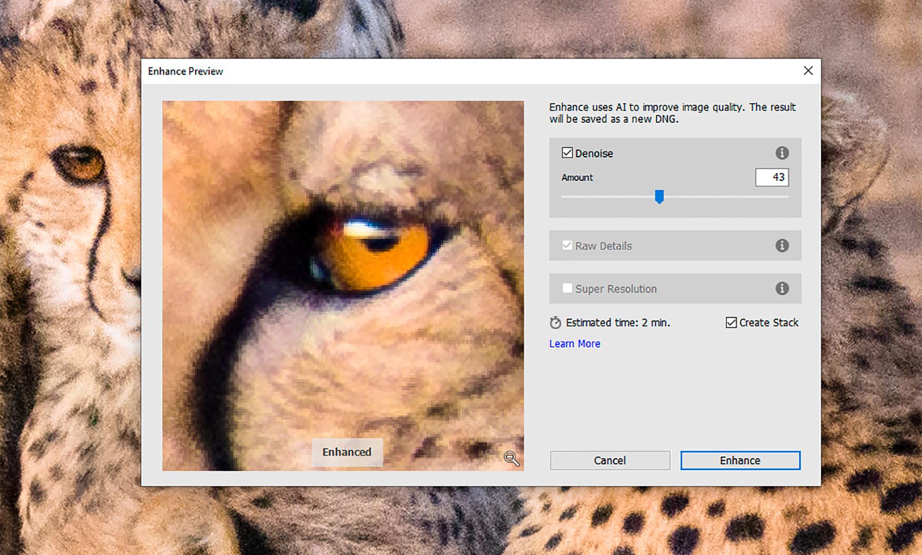 The AI method is listed simply as “Denoise….” In Lightroom it works only on