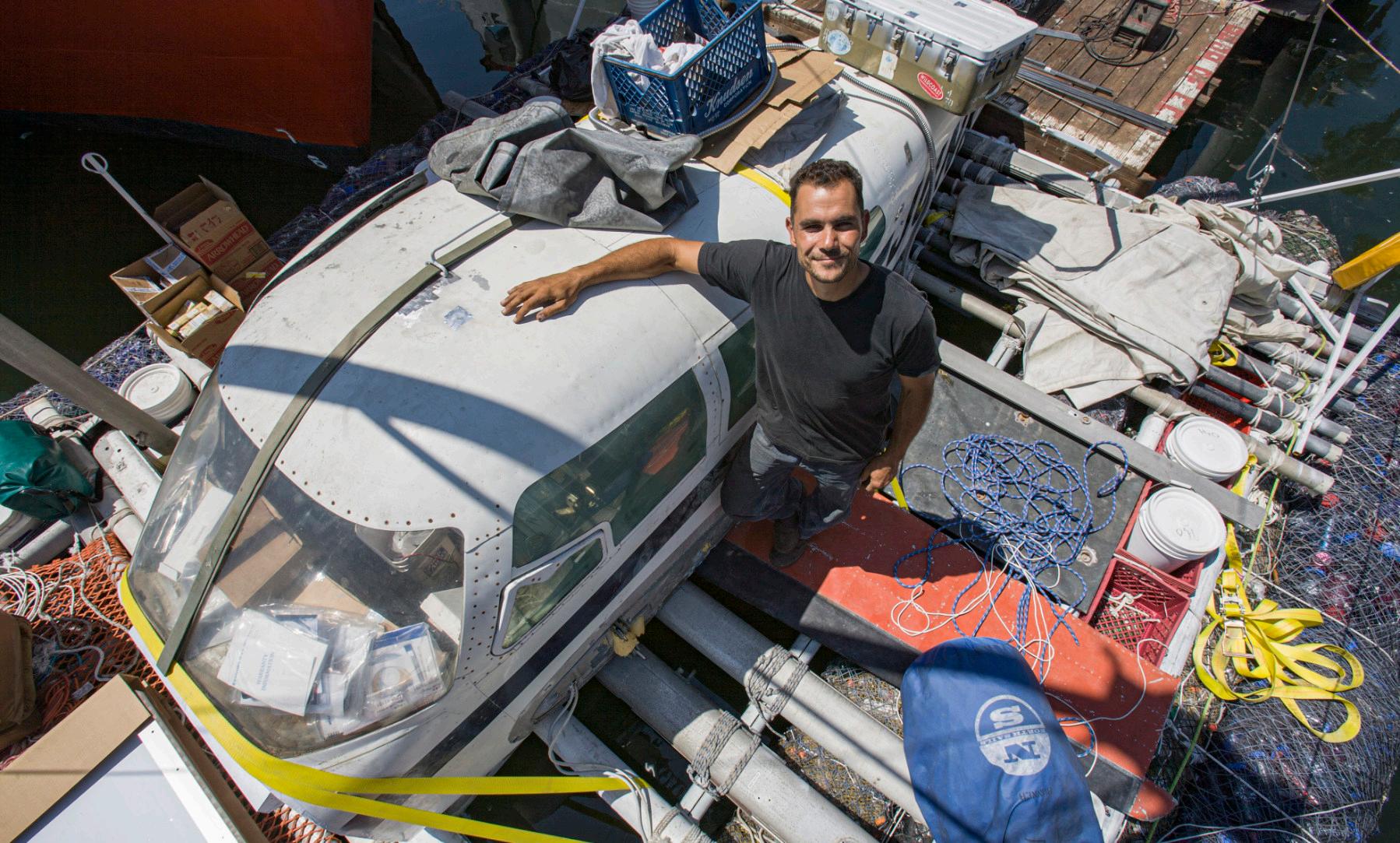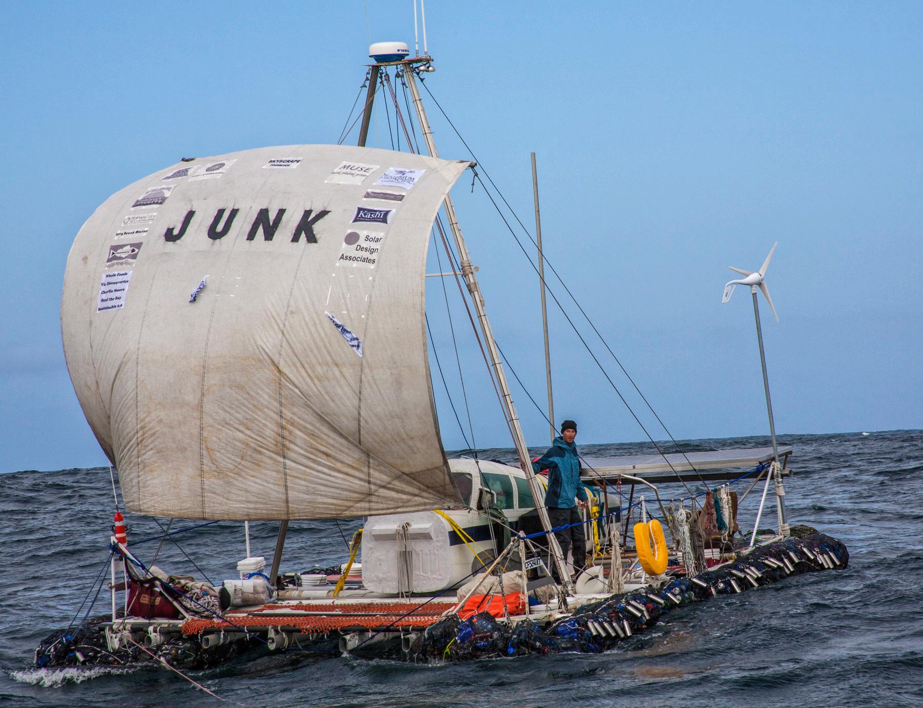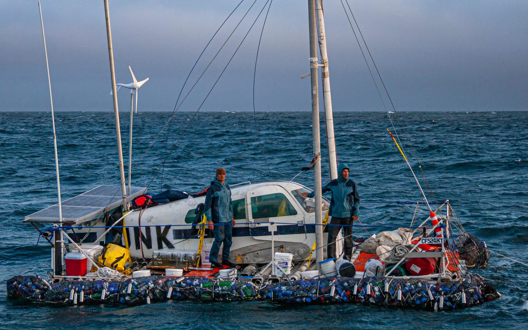 Peter Bennett documented the construction and first days of the Junk Raft, a seaworthy vessel floating on a pile of discarded plastic bottles. It set out from Southern California bound for Hawaii, where it made landfall eight weeks later. (Page 14)