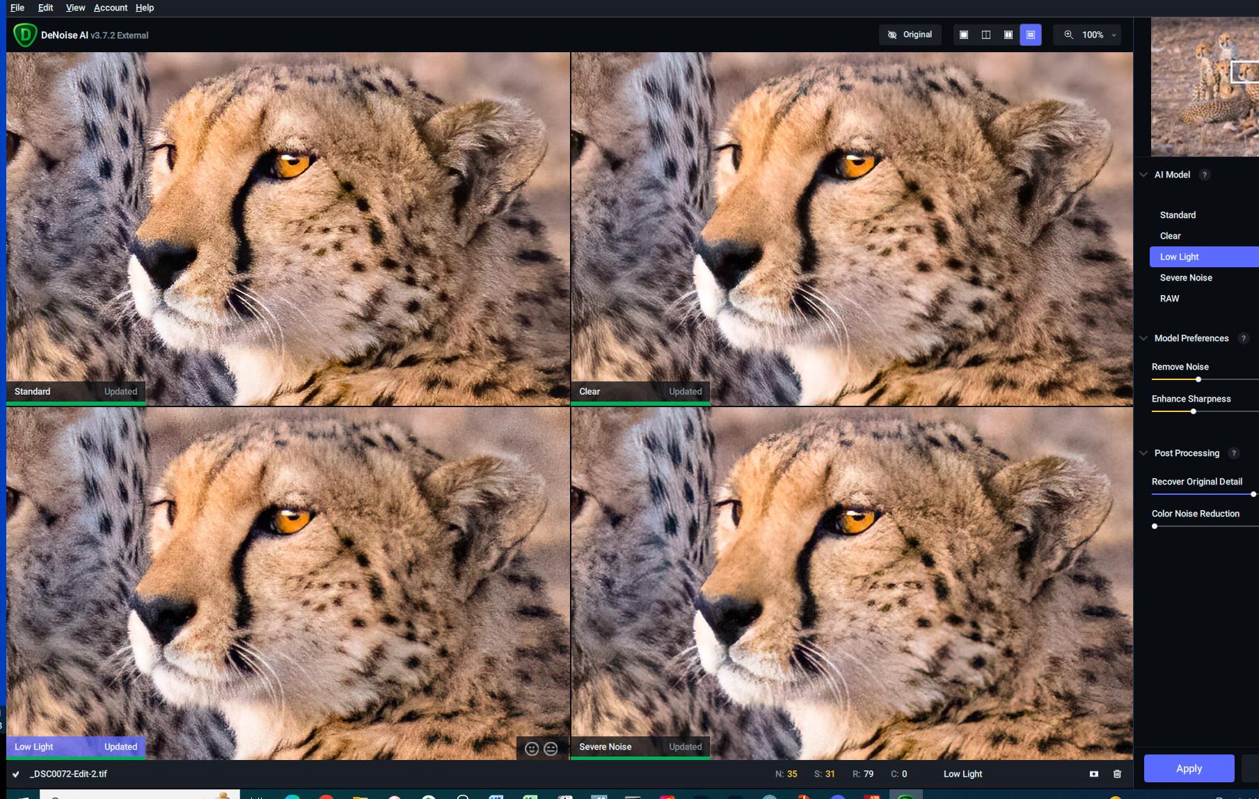 For some other photos, though, I prefer Topaz DeNoise AI. When we went to Kenya I knew two things: I needed a hand-holdable telephoto zoom with a good vibration reduction system; and I was going to need denoise software when I got home. When we returned I purchased Topaz DeNoise AI (Lightroom’s AI offering wasn’t available yet), and I found it to be the perfect tool.