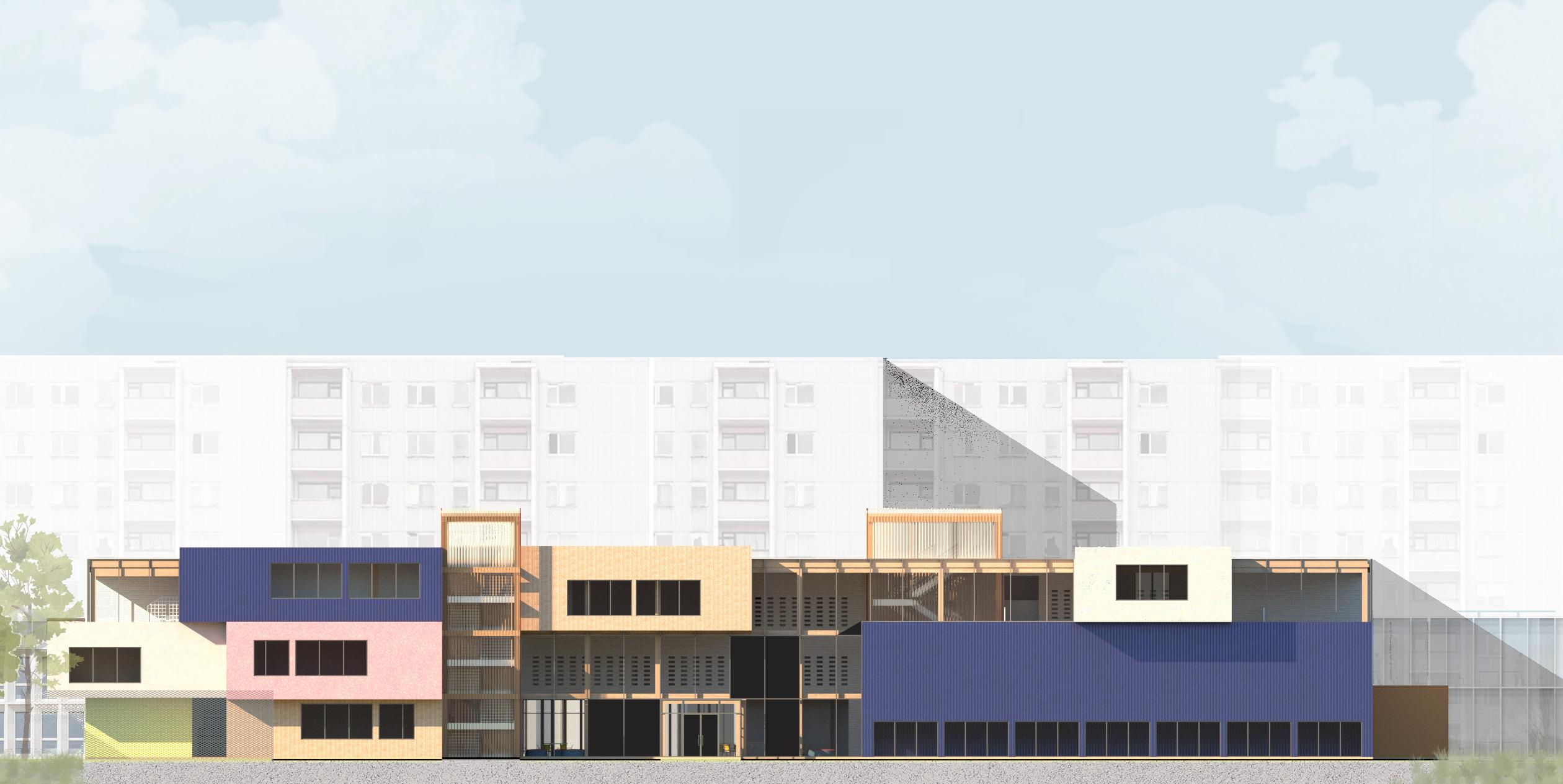 L’école primaire, bordant la place publique, se situe à l’Est de l’écoquartier. Ayant pour vocation de stimuler les cinq sens de l’enfant, l’école est aménagée selon un jeu de blocs générant des pleins et des vides. Volumétriquement, elle est composée de deux entités séparées: Le premier volume étant un plein et regroupant toutes les classes de l’école en une barre longitudinale. Le deuxième volume est quant à lui qualifié de vide dans lequel viennent se greffer des volumes pleins accueillant les fonctions plus ludiques et communes de l’école. La spatialité de cette entité se veut donc intéressante, générant des effets de compression et d’expansion, l’éclatement représentant d’une certaine manière l’école du futur.