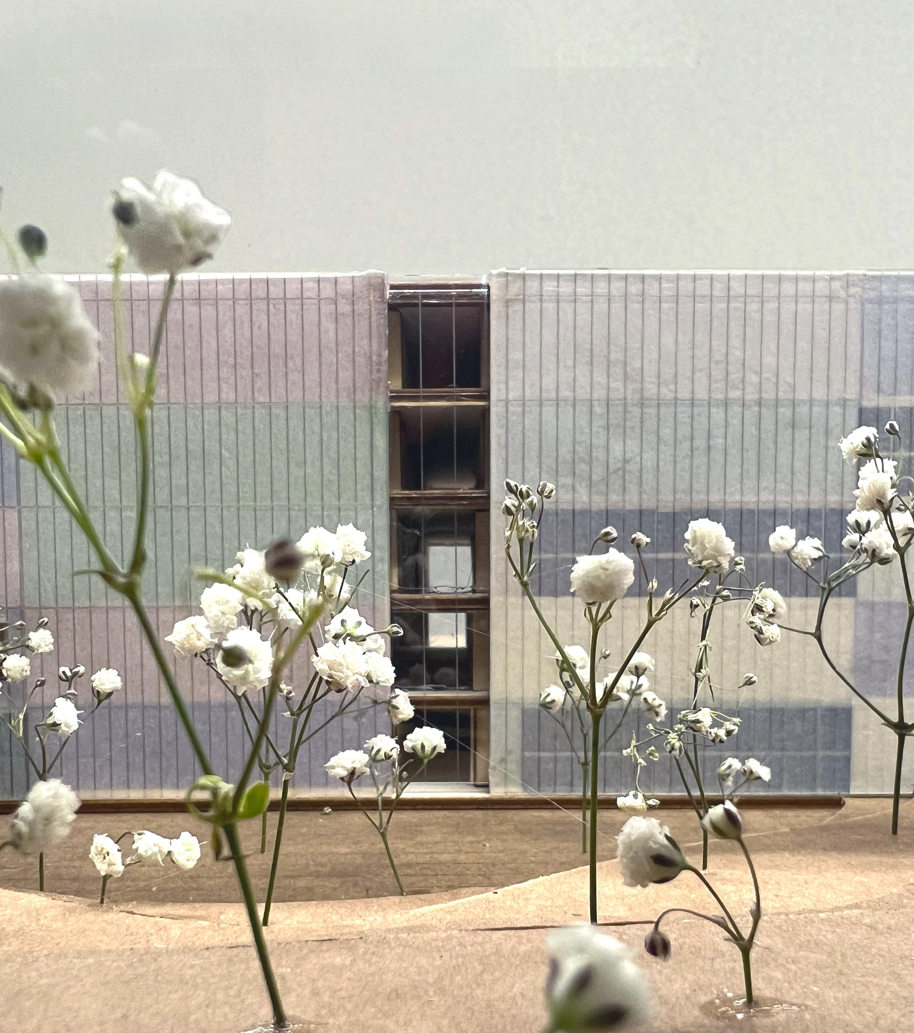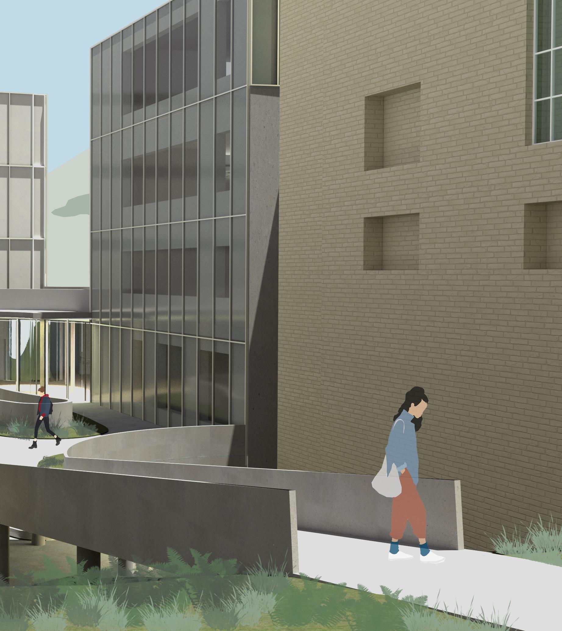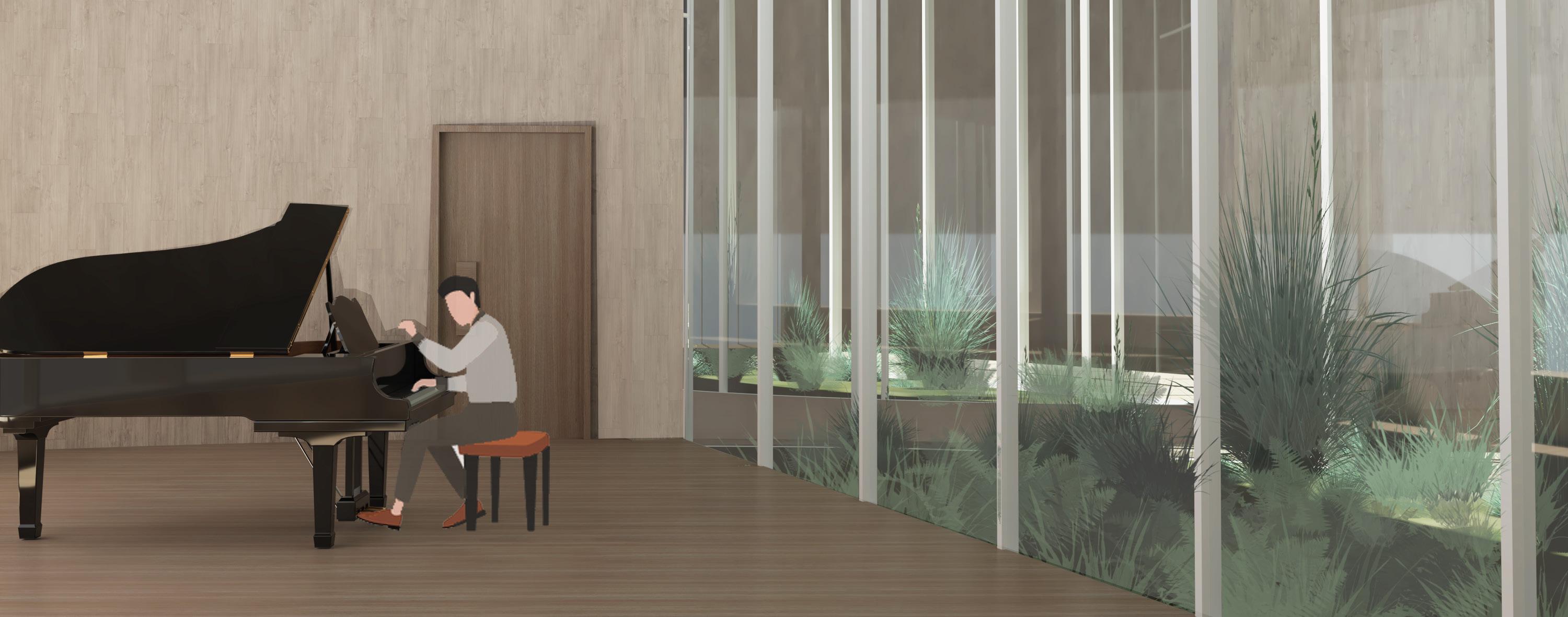 La forme organique connecte les trois blocs ensemble, celui de la bibliothèque, de la salle de spectacle et l’administratif. Le volume est percé de patios semiovoïdales lanssant la lumière et la végétation infiltrer les studios de musiques. La transparence de l’enveloppe au niveau du rez-de-chaussée met en relation la vue à la montagne, la végétation ainsi que la vue vers la ville. La connexion à la faculté existante se fait à partir du volume de la bibliothèque grâce aux escaliers du coté sud. La structure est en bois lamellé collé pour ses qualités écologiques et acoustiques mais aussi pour sa flexibilité et sa capacité à être cintré.