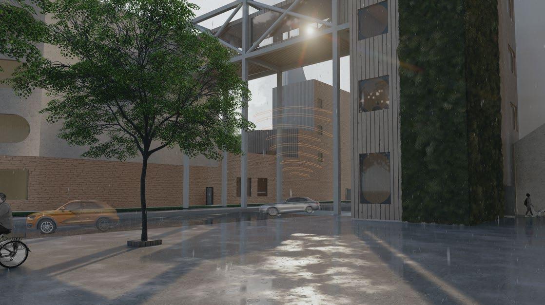 Listening/reading pod, cafe and outdoor greenspace: Semi public realm with focus on natural daylighting and outside greenery.