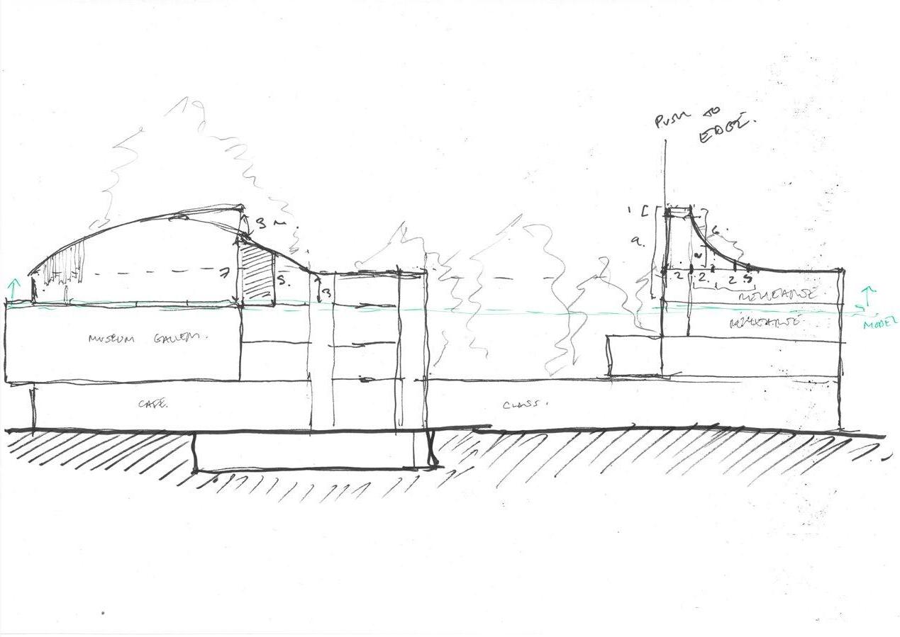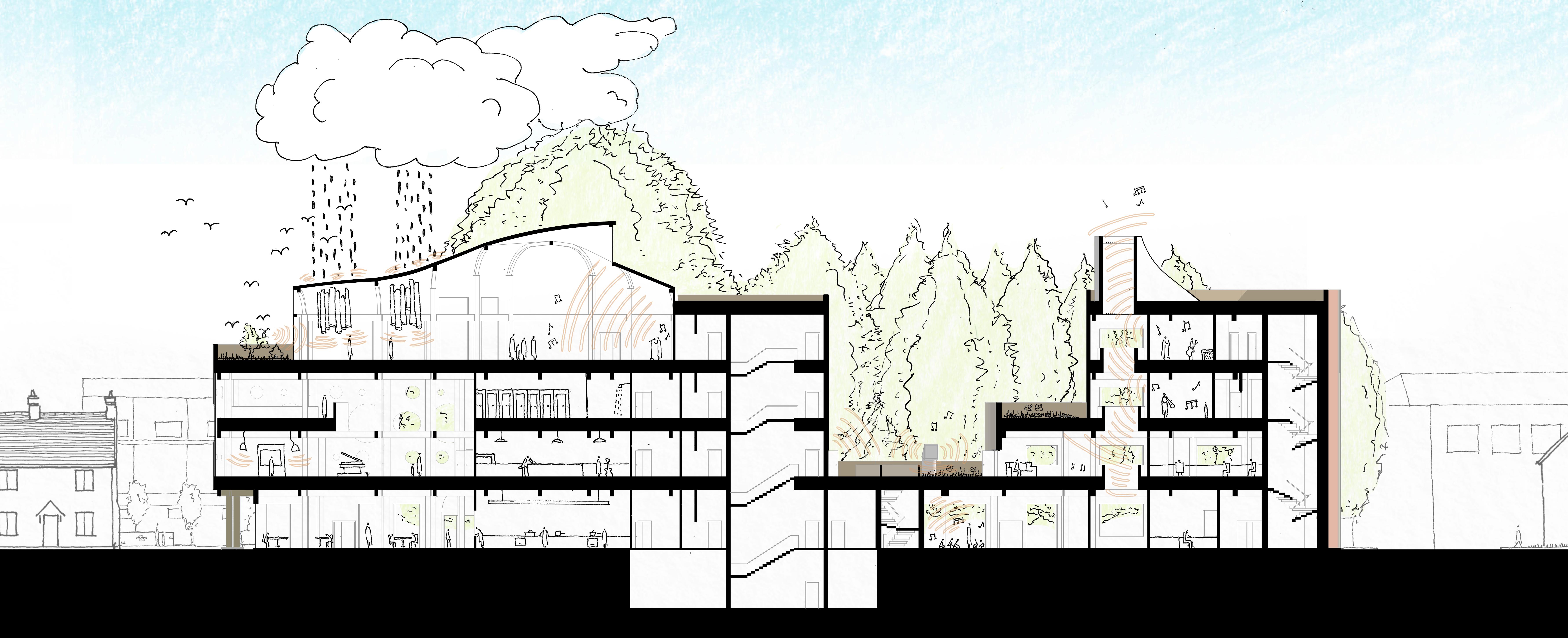 Concerned with the movement of people through the building and the potential for sound to shape our perception of space, the design had a strong focus on implementing sonic effects to play with the users’ experience of the site. The shape of the building also considered solar gains and passive ventilation, as seen in initial sketches above the larger section.