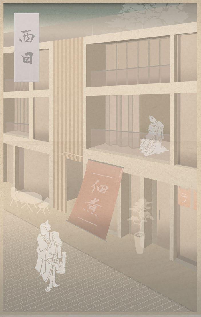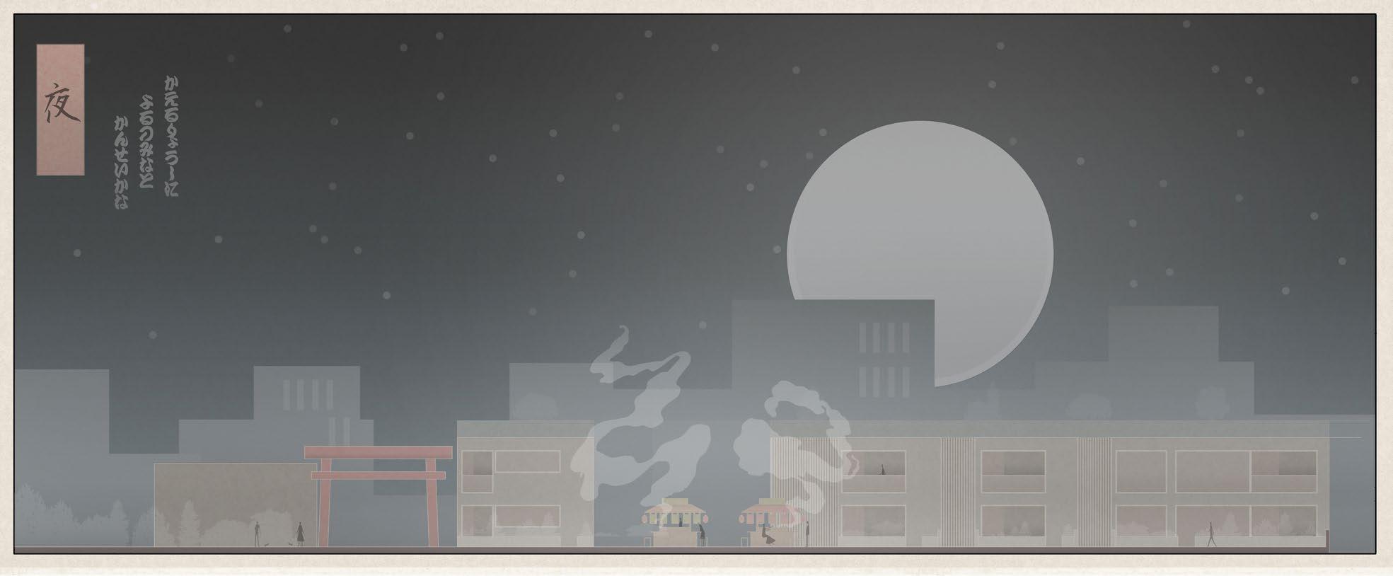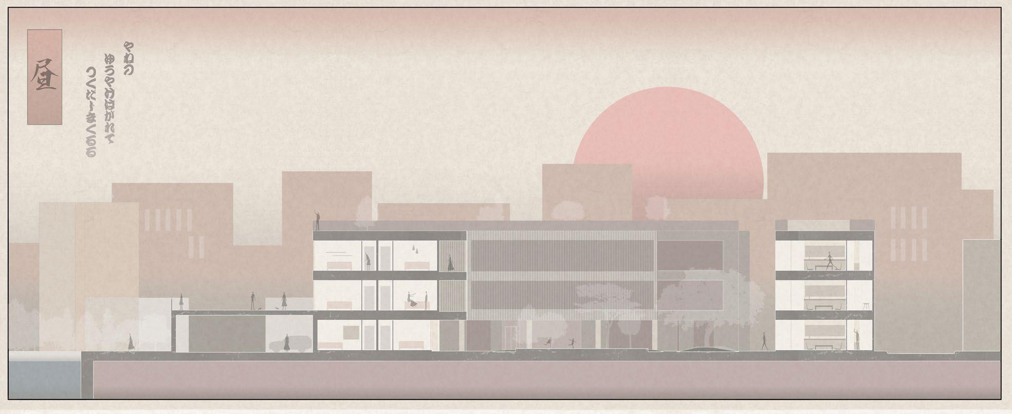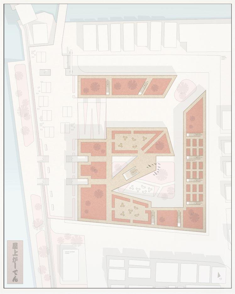 Uniting the detached apartments, embodied the center of the site is a series of shared community spaces which lead to a roof-top garden, offering views over a river-facing terrace upon which local fishermen sell their catch in traditional yatai stands.
