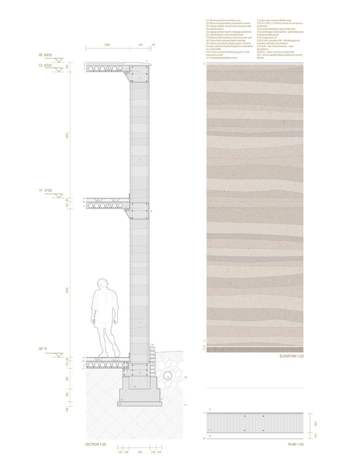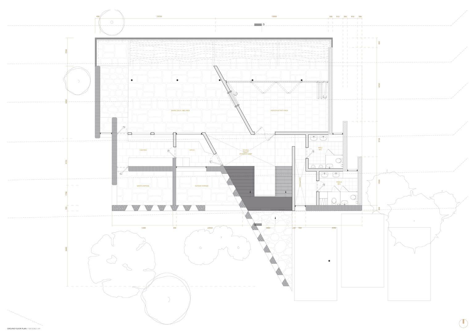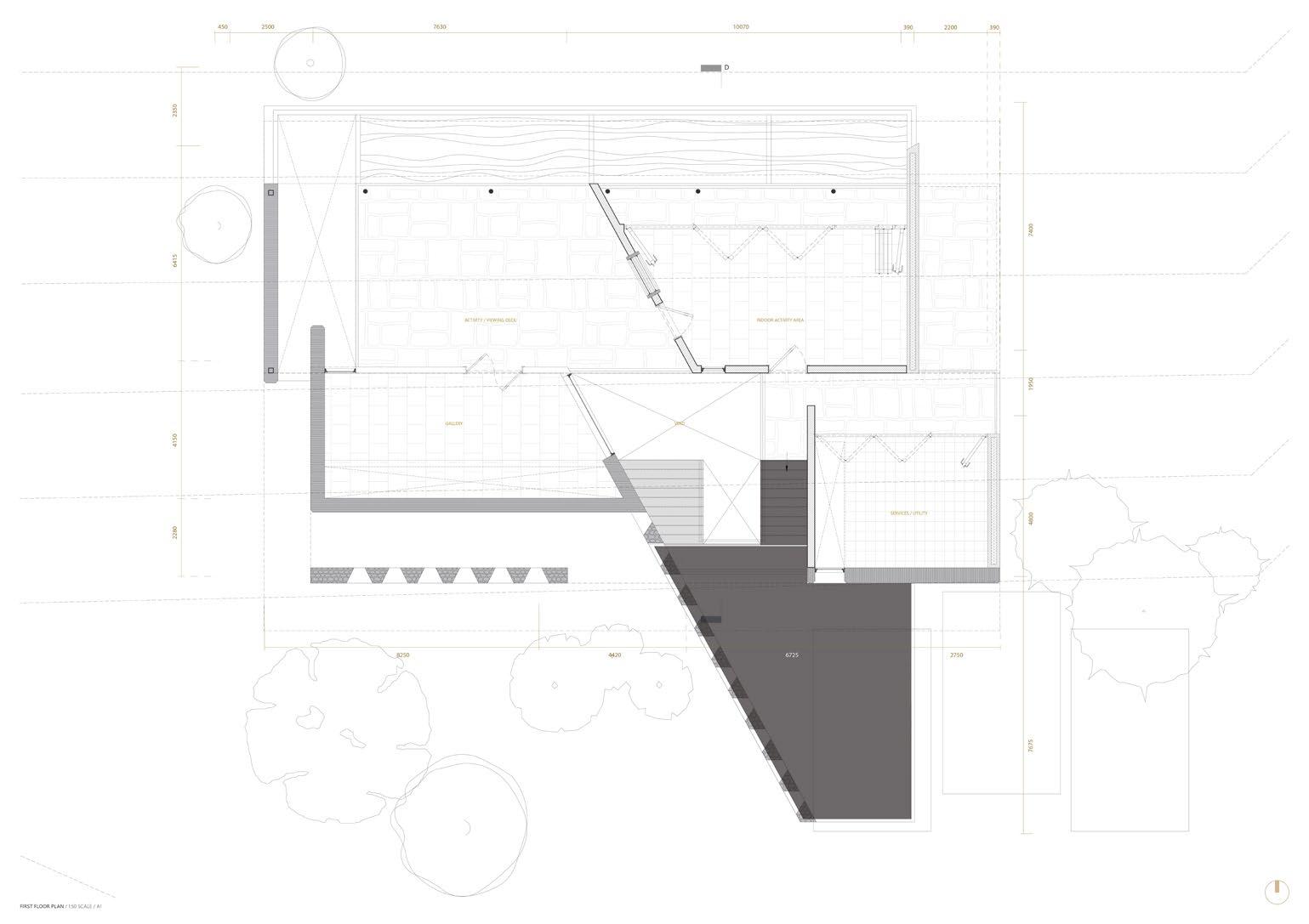 Located on the southern edge of a dramatic water-filled openair mining shaft, the design draws upon the joint influence the surrounding historical mining structures, traditional rural vernacular architecture, and contemporary Australian design. Wide outdoor decking spaces are coupled with indoor activity rooms and restroom facilities, allowing the pavilion to serve local community groups, visiting tourists, and as a gallery for the outdoor museum it sits within. In this unique historical context, local materials have been repurposed where possible, the structure constructed from the site itself with a foundation of local stone and walls of rammed earth and recycled brick.