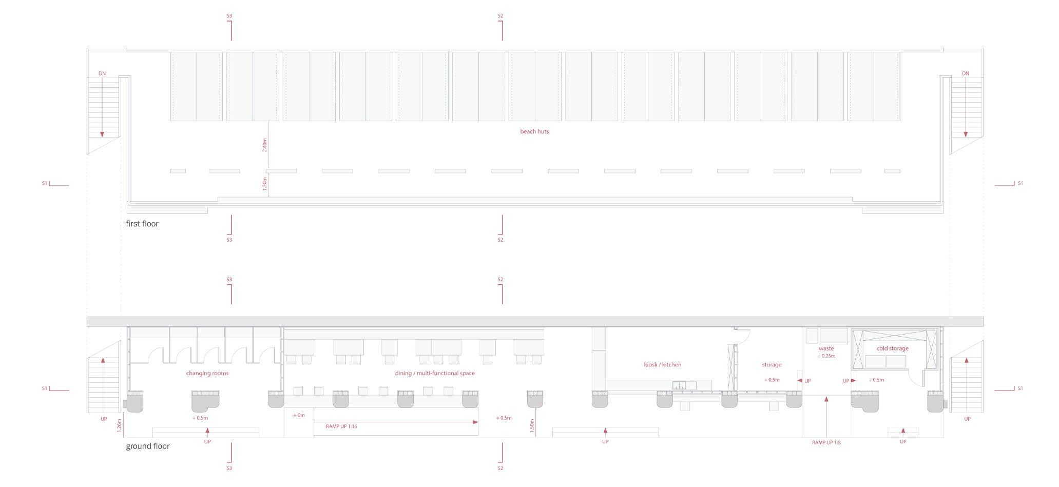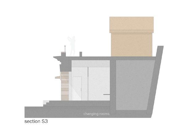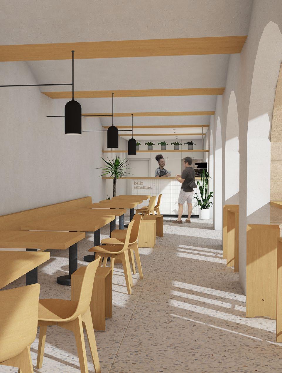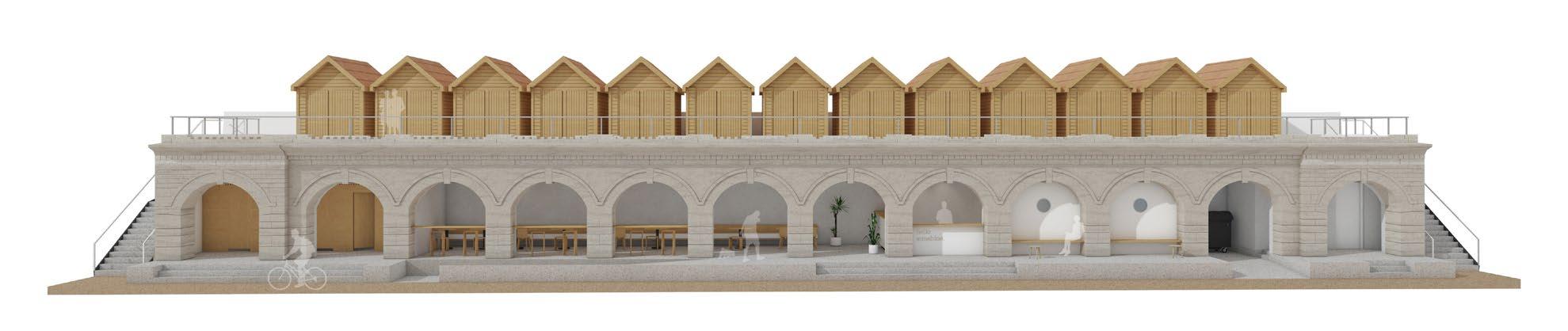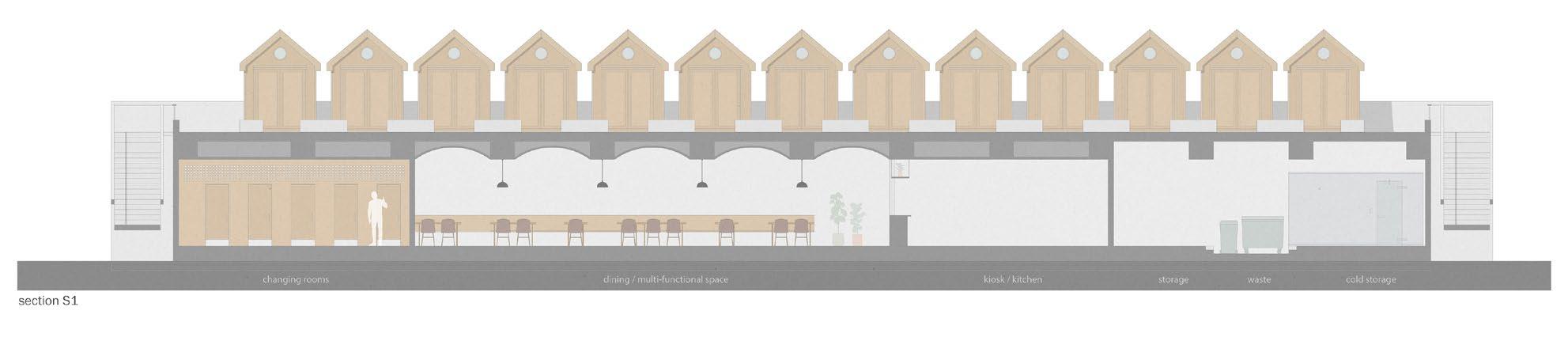 The new design removes the existing temporary beach office and storage space and introduces new community changing rooms and a beachside kiosk offering. Five arches of the space have been retained as flexible multifunctional areas for the public and would be rentable for community activities such as yoga. The kiosk is designed to open seasonally to meet demand, while the remaining arches are usable year-round. Light, airy white render and simple timber joinery expands the interior space, and locally-sourced recycled timber beams have been introduced and exposed above for structural reinforcement of the cloister.
