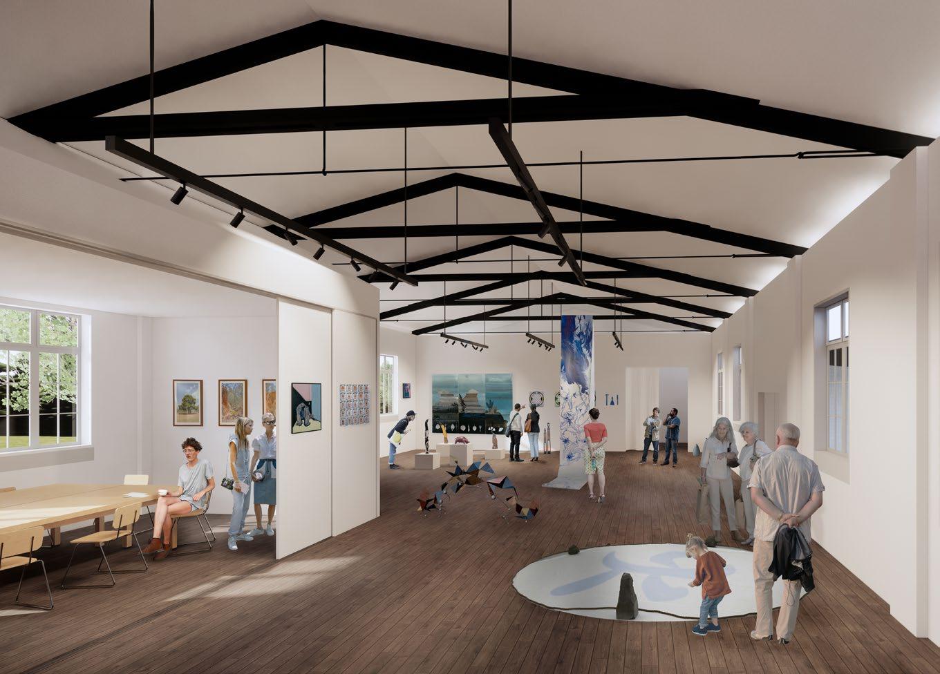 Concerning materials, an in-situ concrete form juxtaposes a Japanese larch lattice roofing structure, which provides a diffused natural light to flexible spaces allowing the exhibition of a diversity of modern artistic expression.