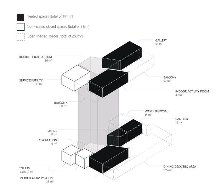 In all aspects sustainable practice has been considered and incorporated, with the pavilion operating off-grid with a onehundred percent renewable energy system. Special attention has been paid to thermal zoning, served spaces can be heated in winter, and fully opened in summer months to take advantage of natural cross ventilation. Thermal massing matched to a carefully calibrated solar-shading system responds to the seasonal climatic fluctuations and takes advantage of thermal lag. A hollow-core precast concrete slab-on-ground is earth coupled and minimises embodied energy with the incorporation of e-concrete and geopolymer technology. Roof mounted solar panels supply all heating and lighting energy needs, with a sustainable rainwater system recycling grey water through natural filtration systems onto a native garden bed. Surfaces have been left unfinished where possible, reducing material consumption and maintenance requirements. At the end of the pavilion’s life cycle, elements such as the pre-cast concrete floor slabs, glass windows, metal columns and beams have been designed to be recyclable, minimising waste.