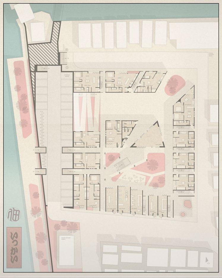 The apartment takes the form of two plazas enclosed by many separate units, which are arranged along the lines of existing roji alleyways as to preserve circulation and integrate the new built form back into the neighbourhood that surrounds it. Rejecting modular housing with unique attention to each apartment space, every unit generates a different interaction with its context, whether opening out to the plaza, or providing views towards the Sumiyoshi Shrine or over the deep Sumida River.