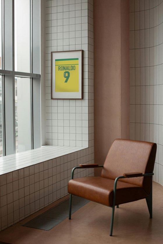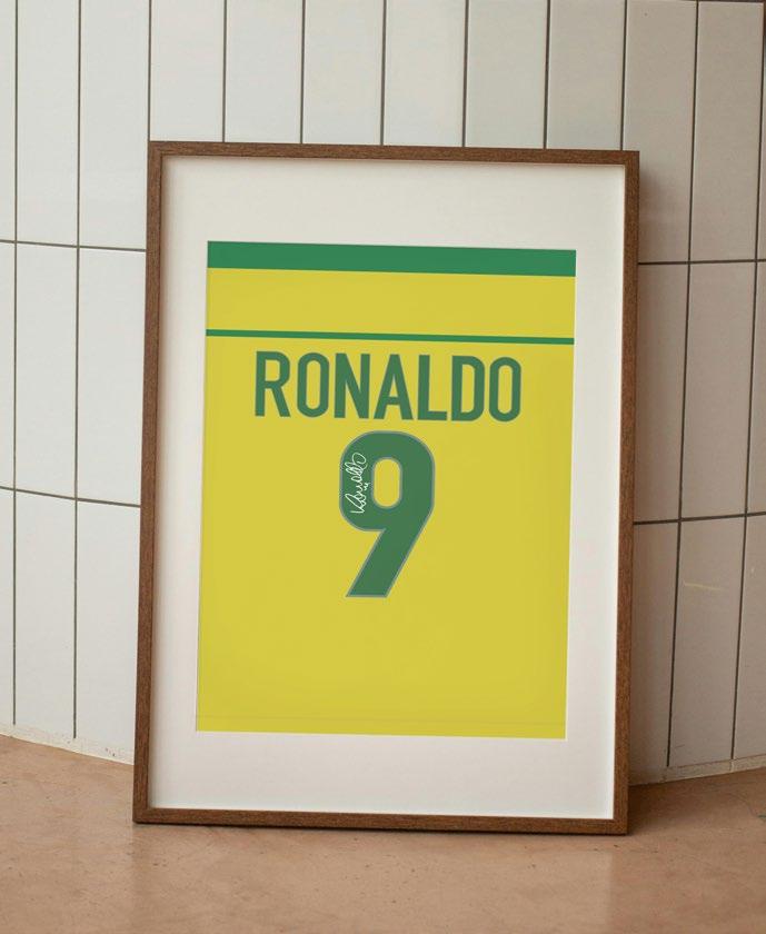 This poster design is part of an ongoing series, with each celebrating an iconic football shirt and player. Featured here is Ronaldo on the iconic yellow and green shirt of the Brazil national football team, who reached the 1998 FIFA World Cup final in France. This series includes similarly themed designs for Manchester United Football Club’s 2008/09 kit, and Lionel Messi and his iconic 2016/17 Futbol Club Barcelona jersey. Created to capture the resurgence in popularity of retro football kit fashion, these posters evoke a strong sense of nostalgia for fans and celebrate the timeless appeal of some of the game’s most iconic designs.