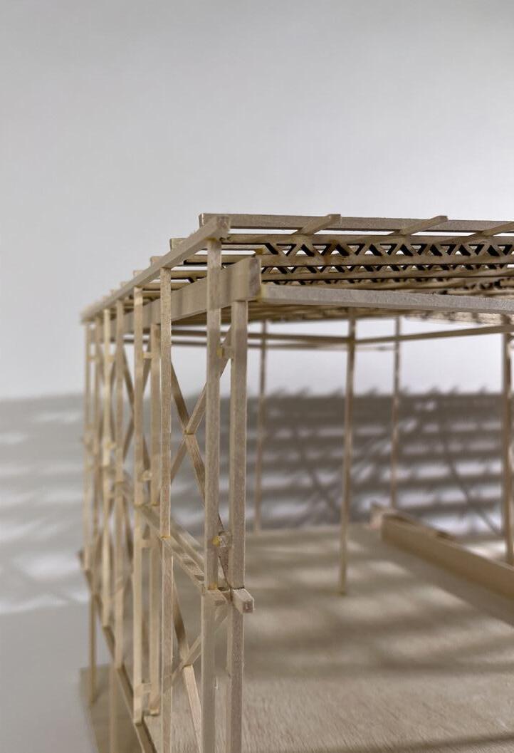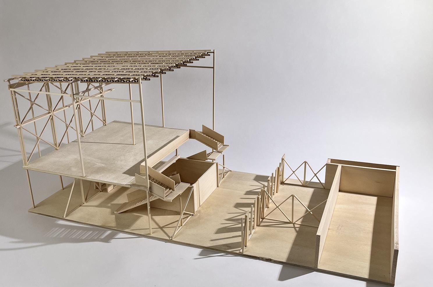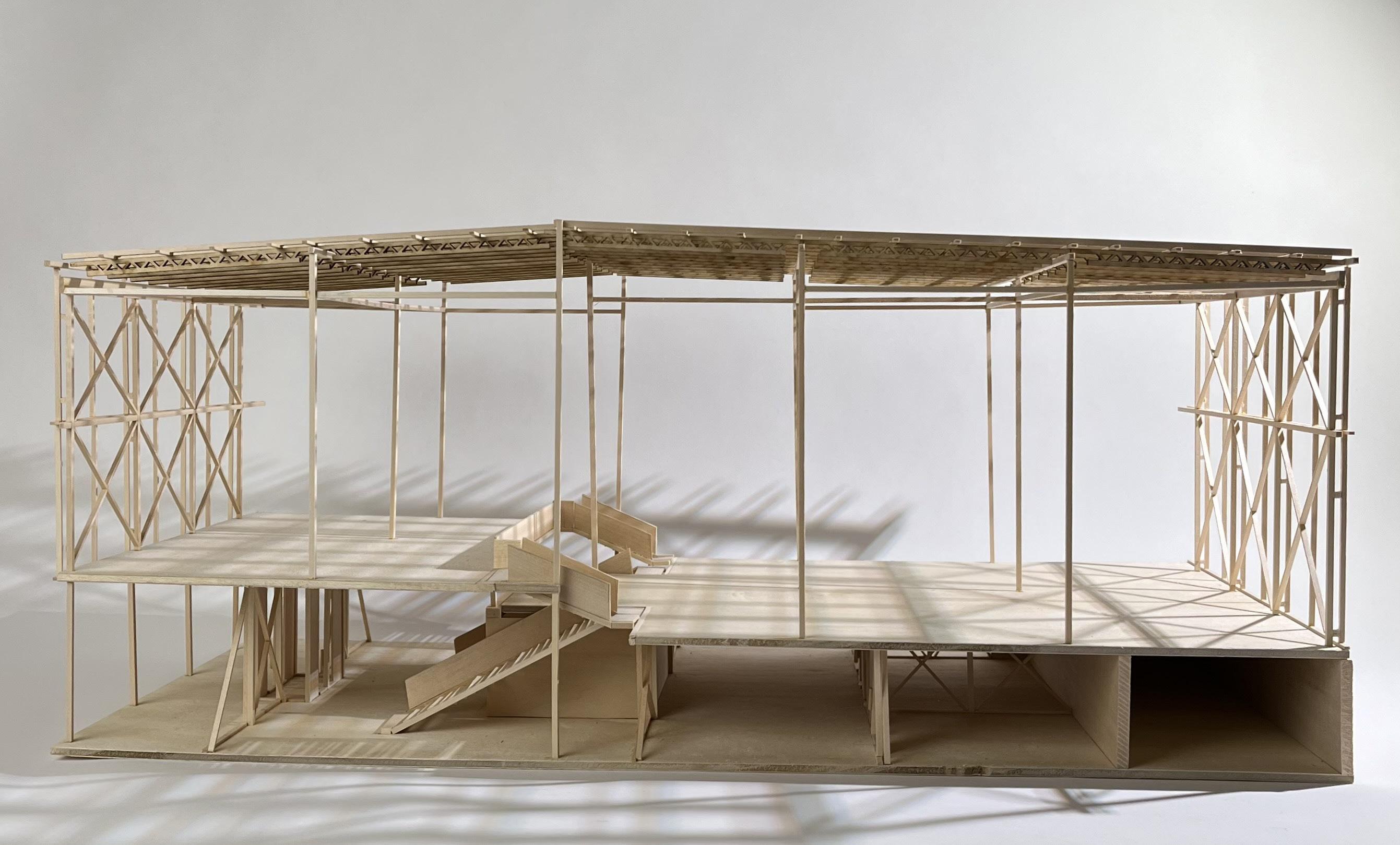 A 1/4-inch scale study model was created to demonstrate the structure and visualize the layout. The model is divided into three pieces, allowing observers to examine each floor individually.