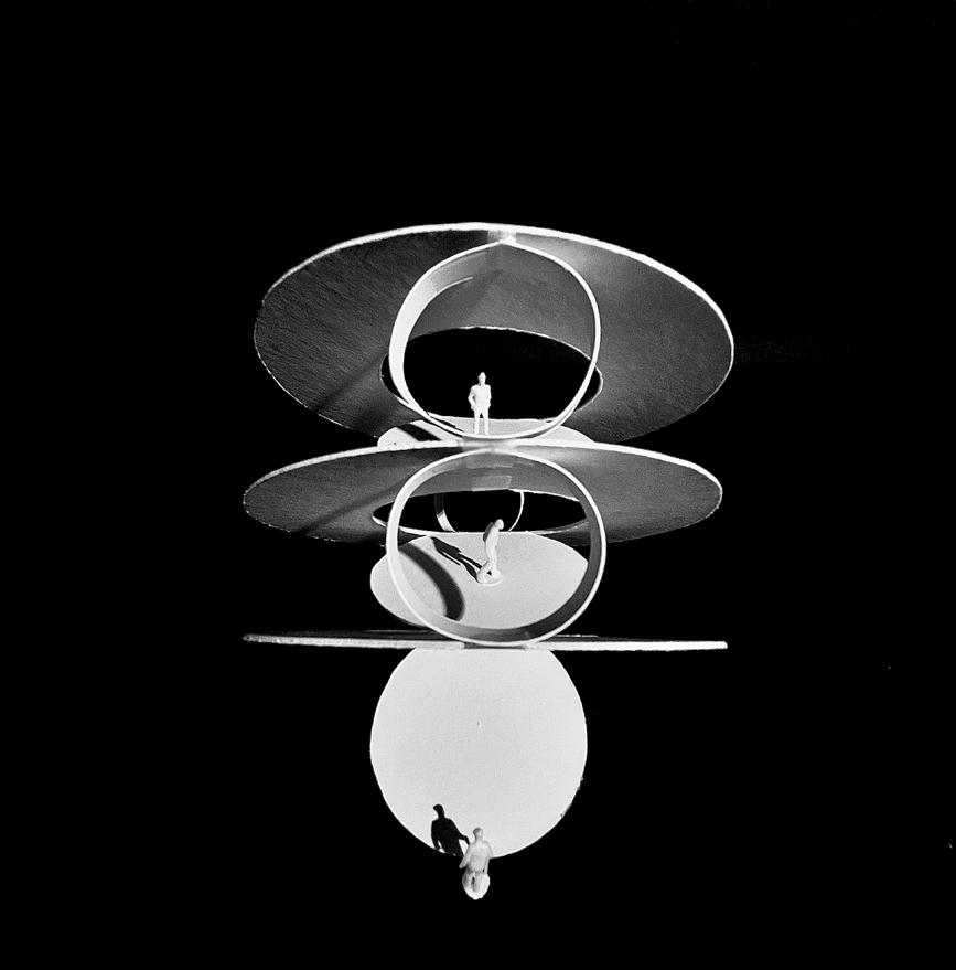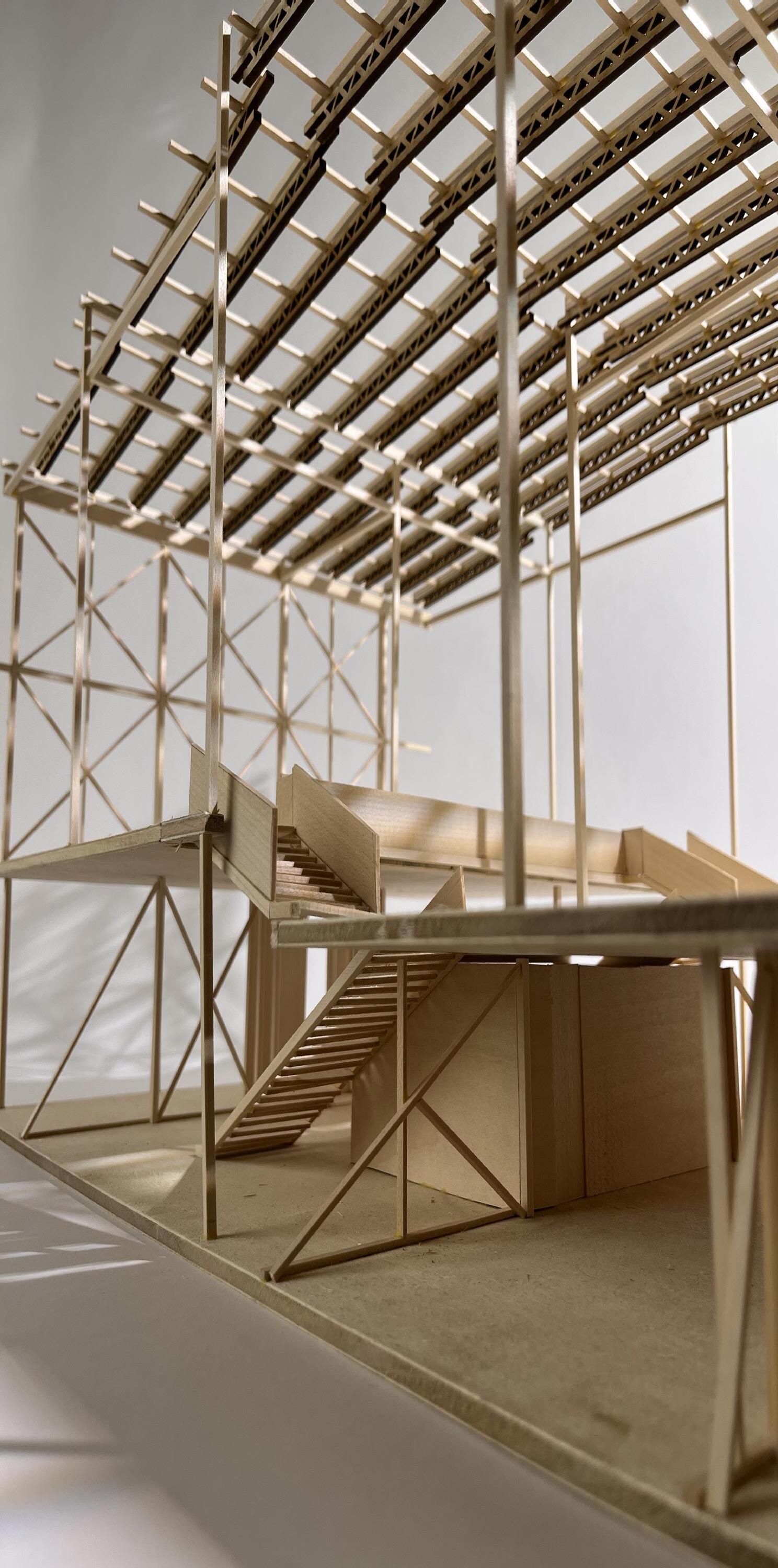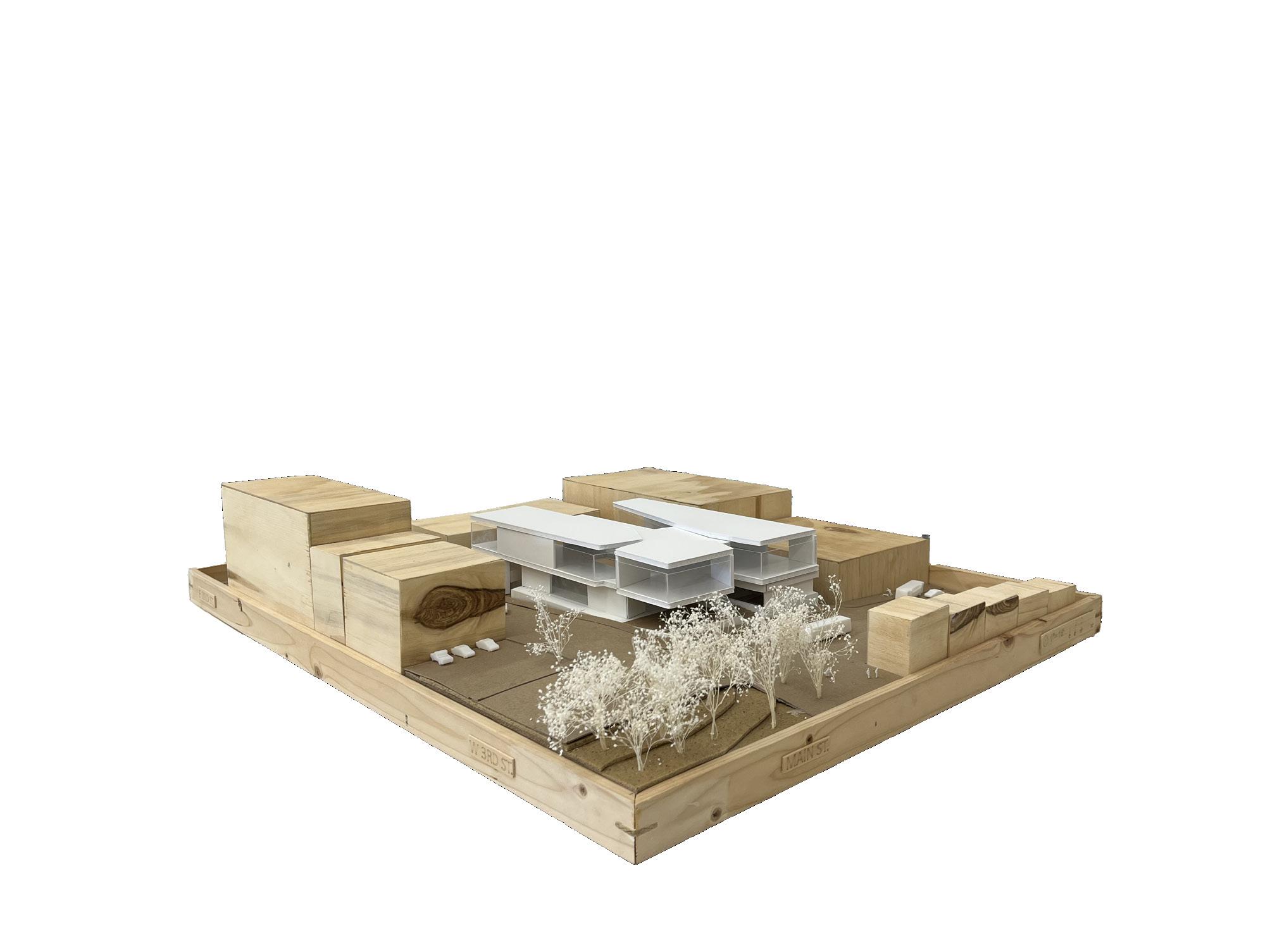 A 1/4-inch scale study model was created to demonstrate the structure and visualize the layout. The model is divided into three pieces, allowing observers to examine each floor individually.