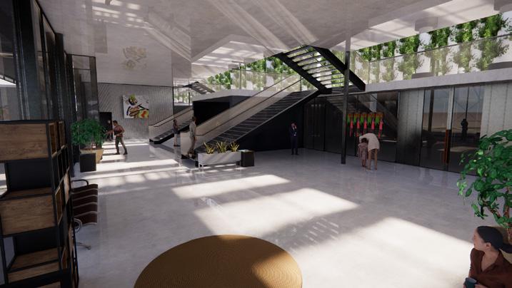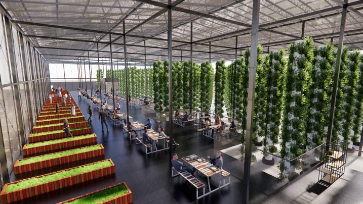 The building features an opening that floods the lobby with natural light upon arrival, while also providing sunlight to the aeroponic towers and other areas throughout the building.