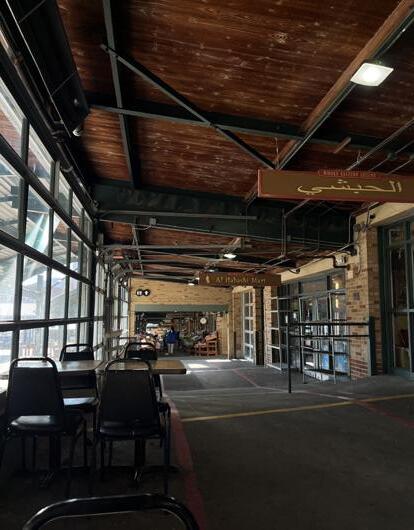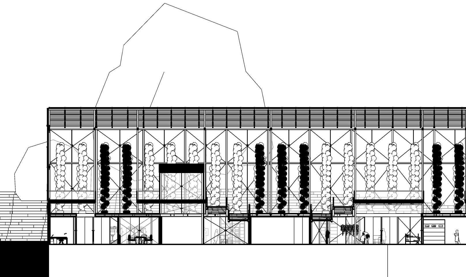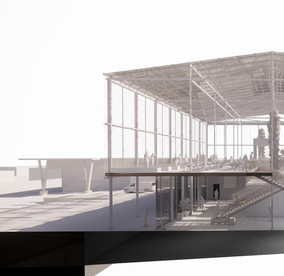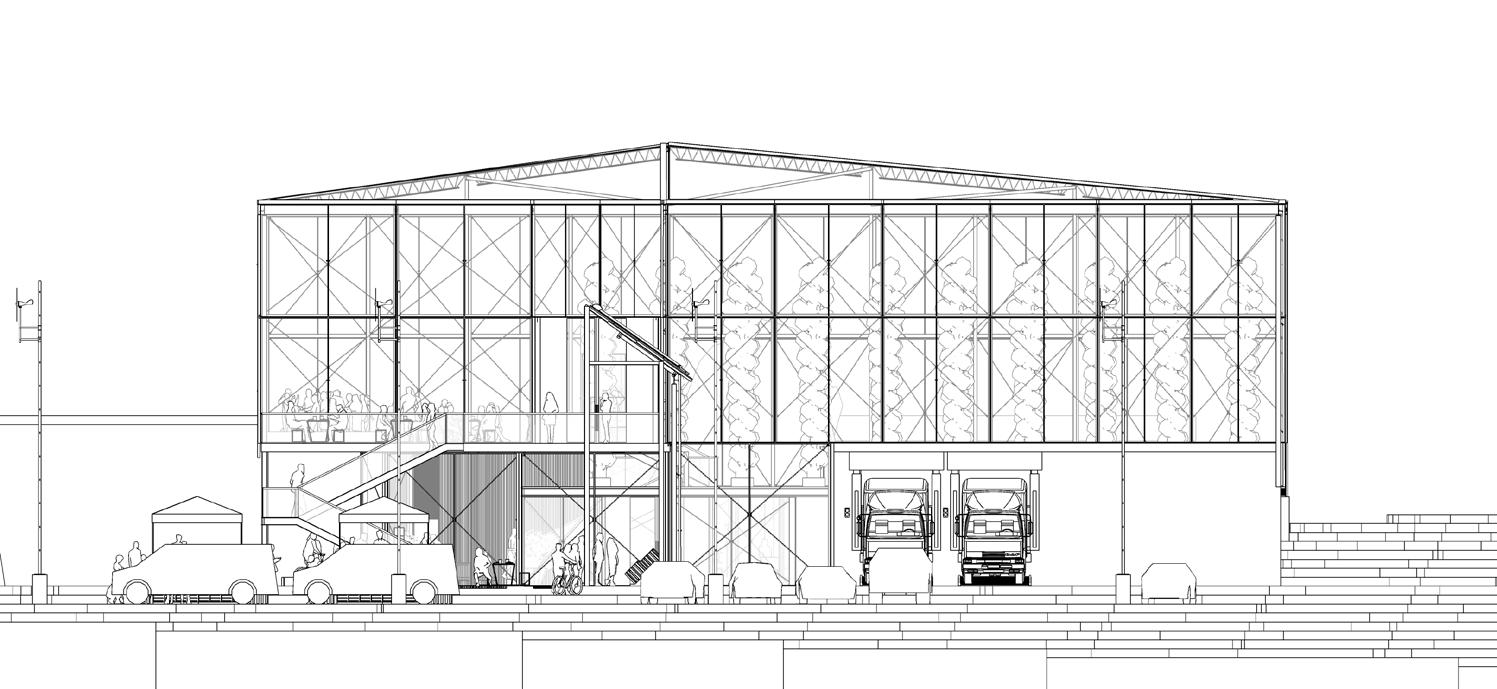 The farmers market features a steel and glass wall that partially shields the importing trucks from public view while providing shade to the market area. Additionally, the wall is topped with solar panels and solar water pumps, which serve both as shading elements and sources of renewable energy.