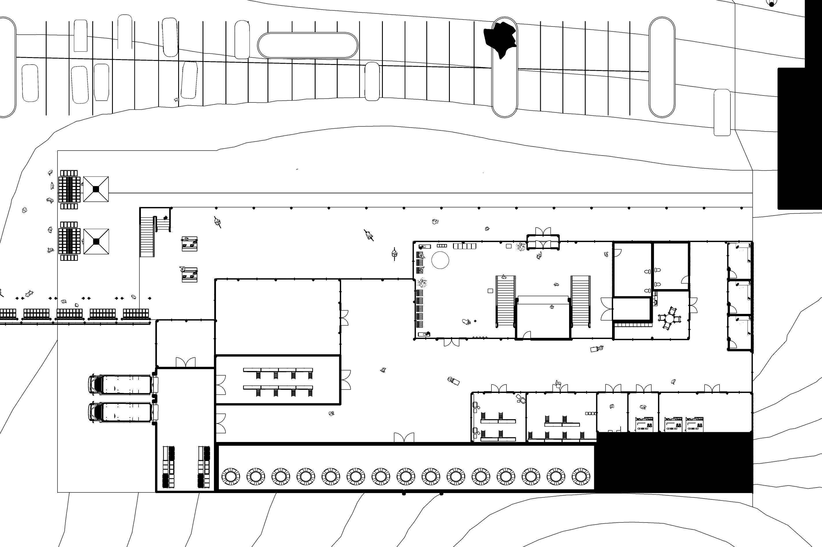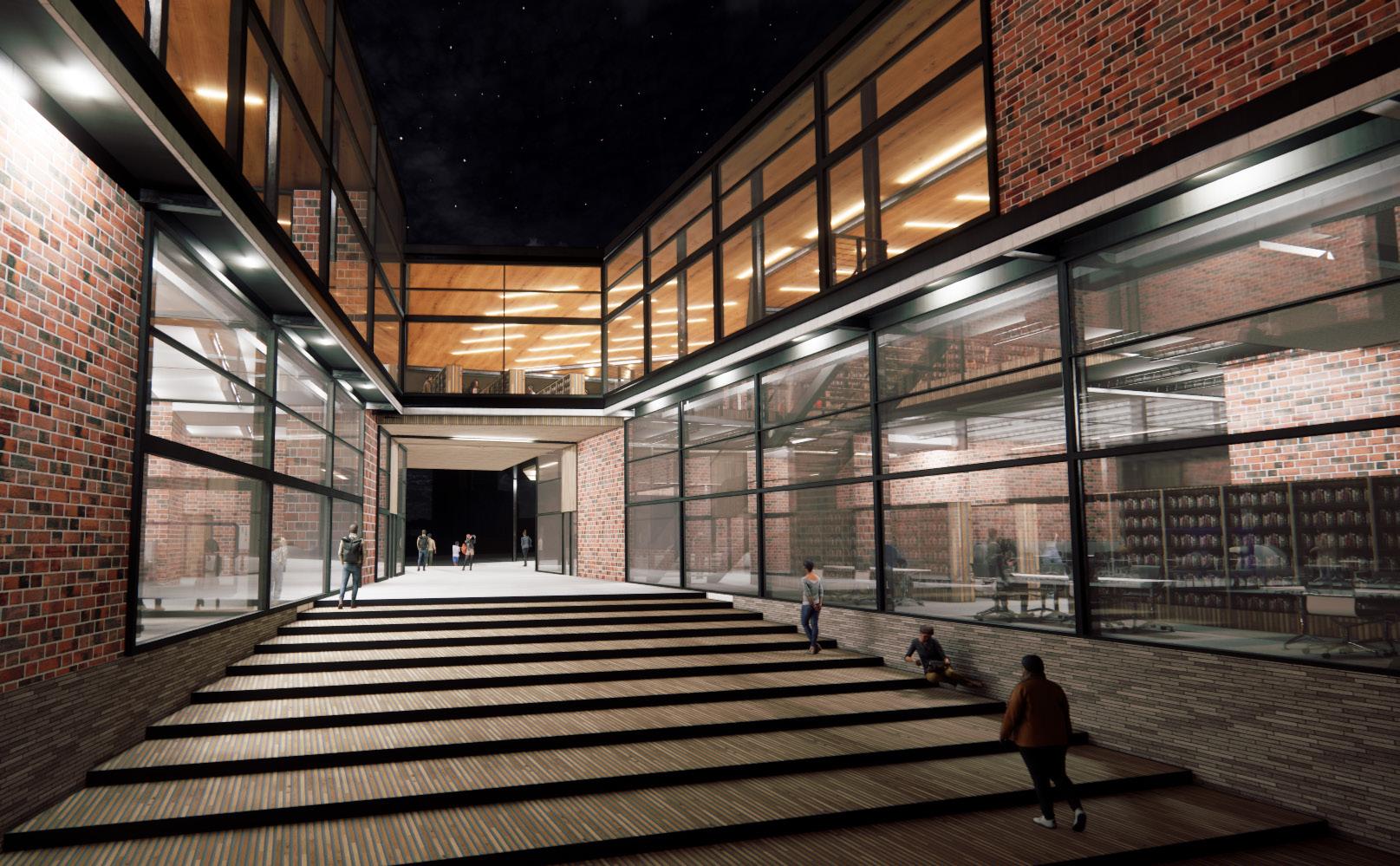 The linear movement is accentuated by the extended façade of the outdoor patio while showing circulation in and outside of the library.