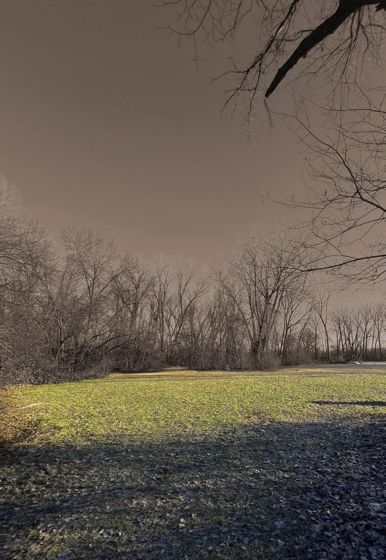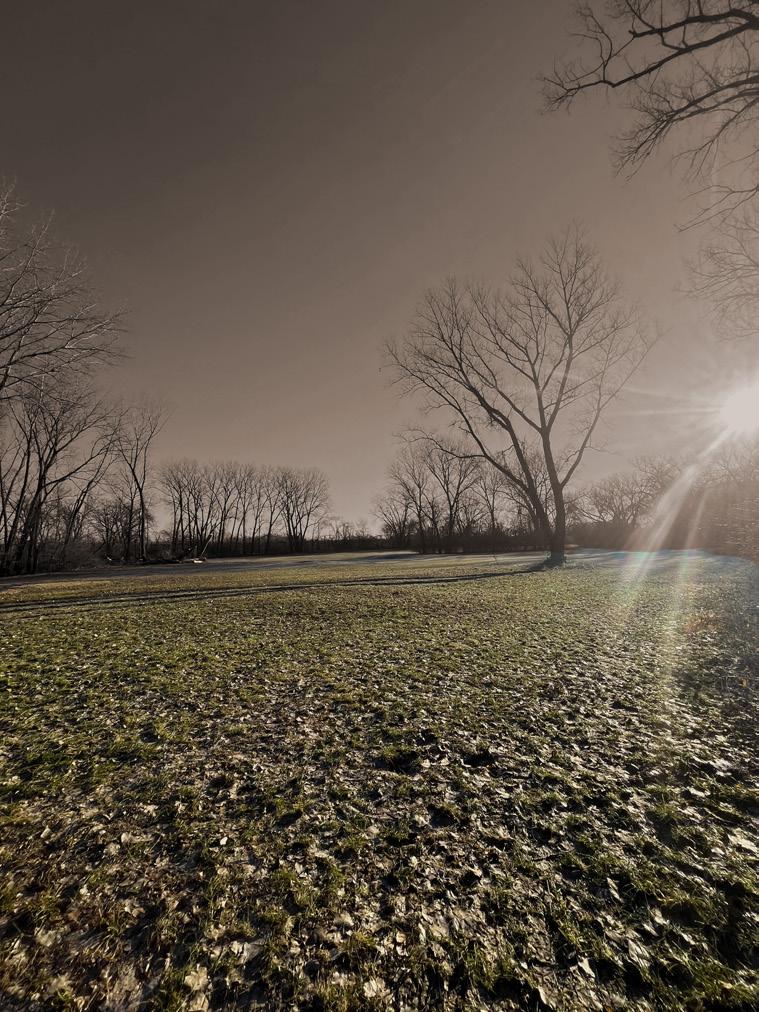 The site was selected for its concealed beauty. Meandering through a trail of lifeless trees, my attention was captivated by a vibrant green clearing. This hidden pocket reveals an open field, basking in direct sunlight. The tranquility is enhanced by the enveloping density of trees, creating a hushed ambiance punctuated only by the melodic chirping of birds.