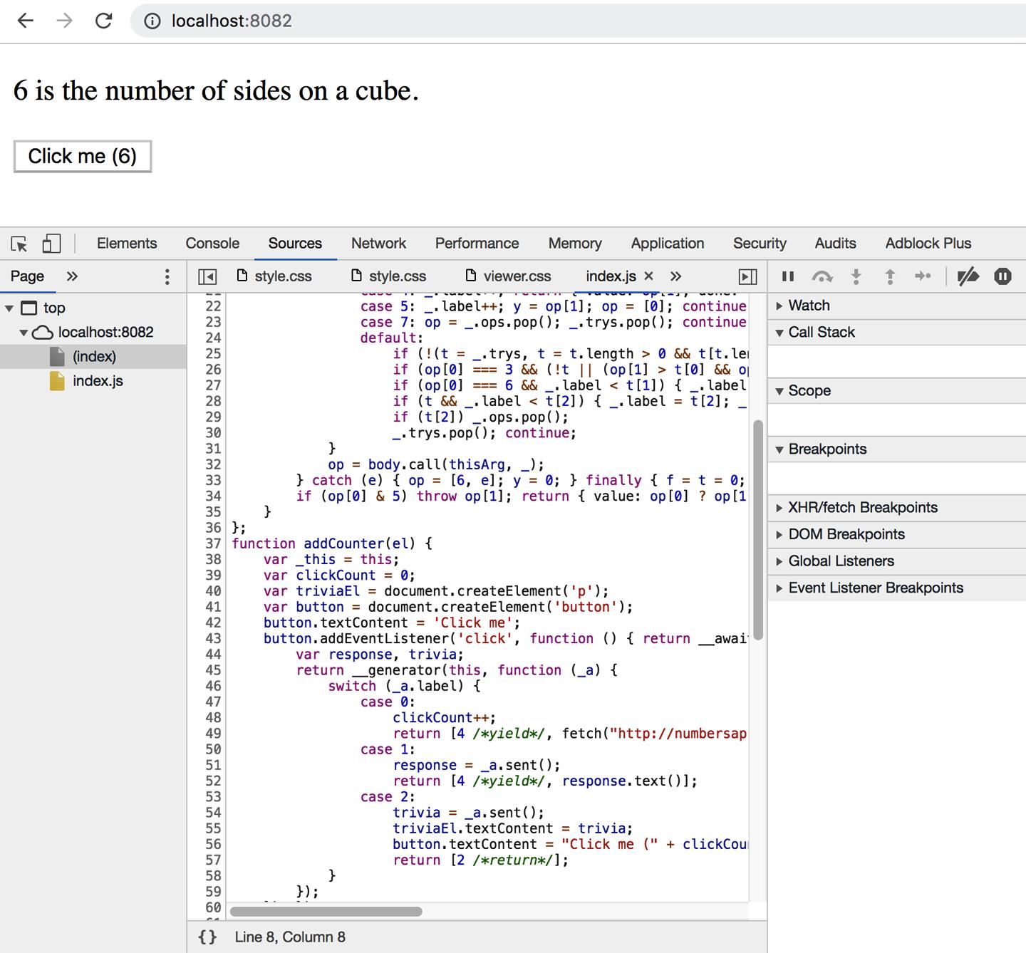 If you load this in your browser and open the debugger, you’ll see the generated Java‐Script. This closely matches the original source, so debugging isn’t too difficult, as you can see in Figure 7-1.