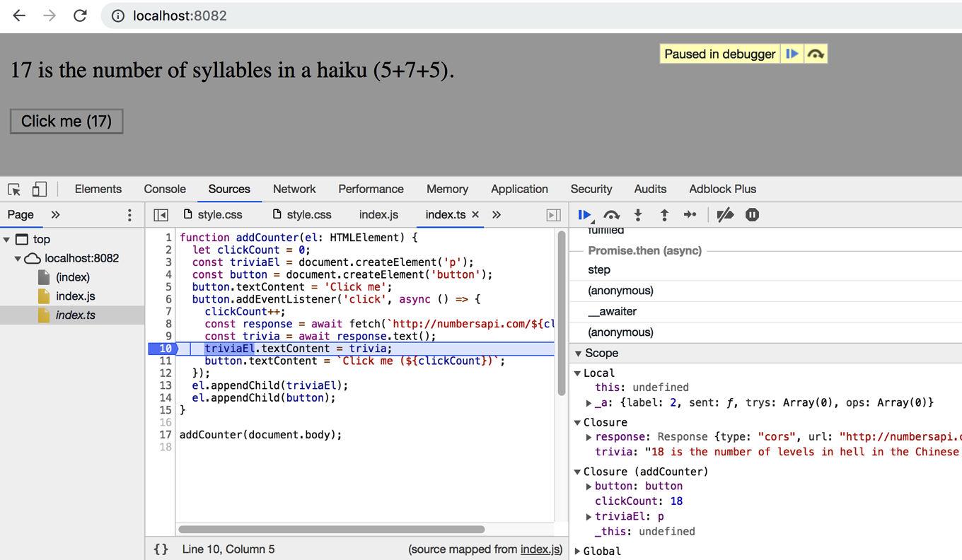 To support async and await in older browsers, TypeScript has rewritten the event handler as a state machine. This has the same behavior, but the code no longer bears such a close resemblance to the original source. This is where source maps can help. To tell TypeScript to generate one, set the source Map option in your tsconfig.json: