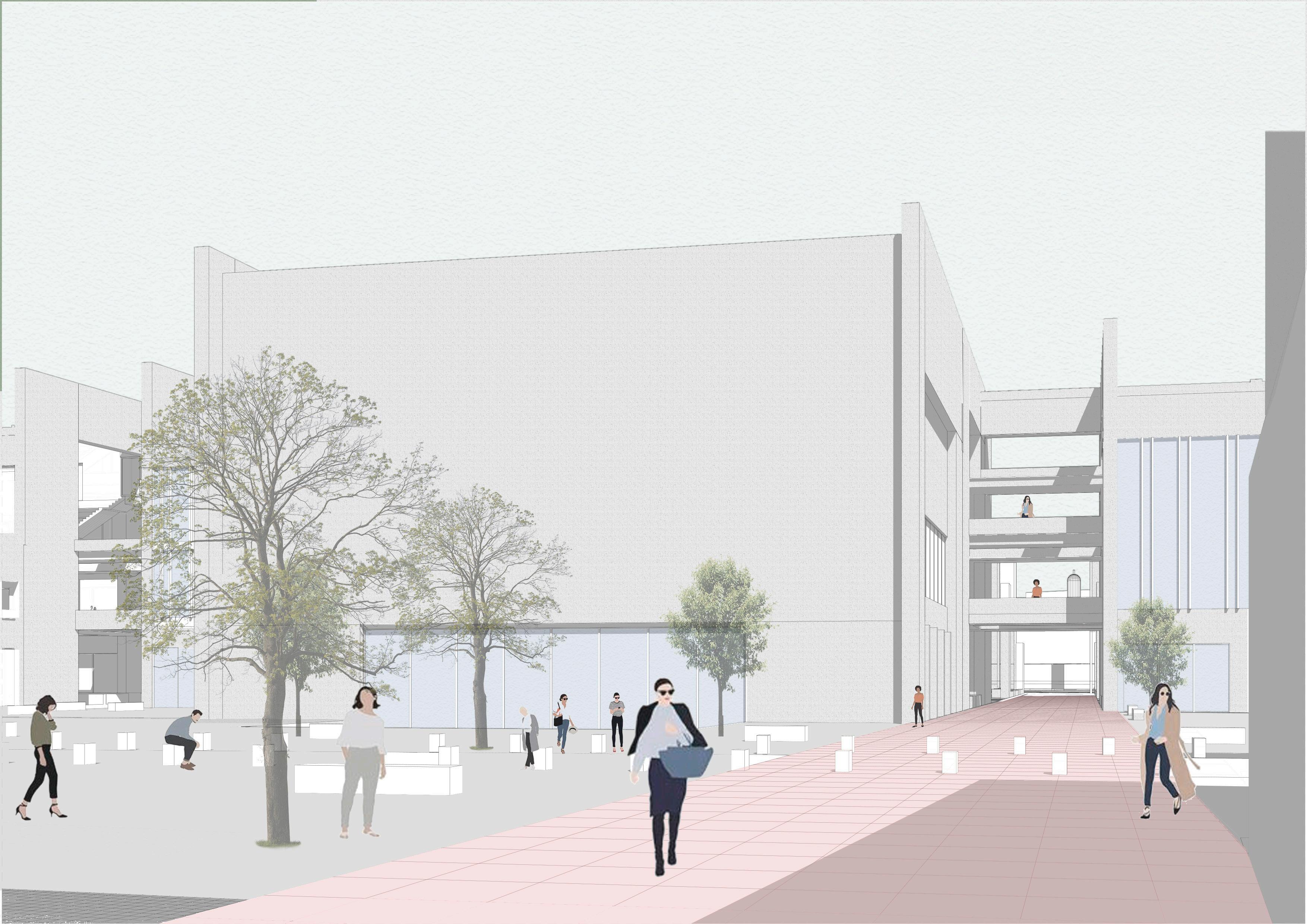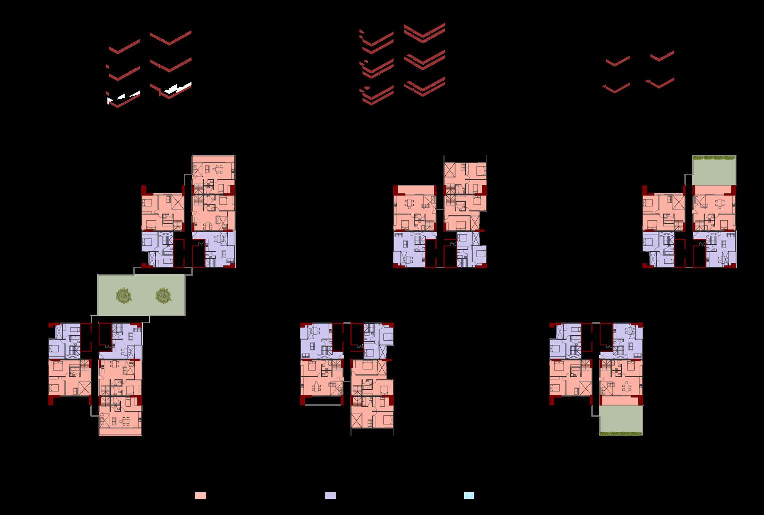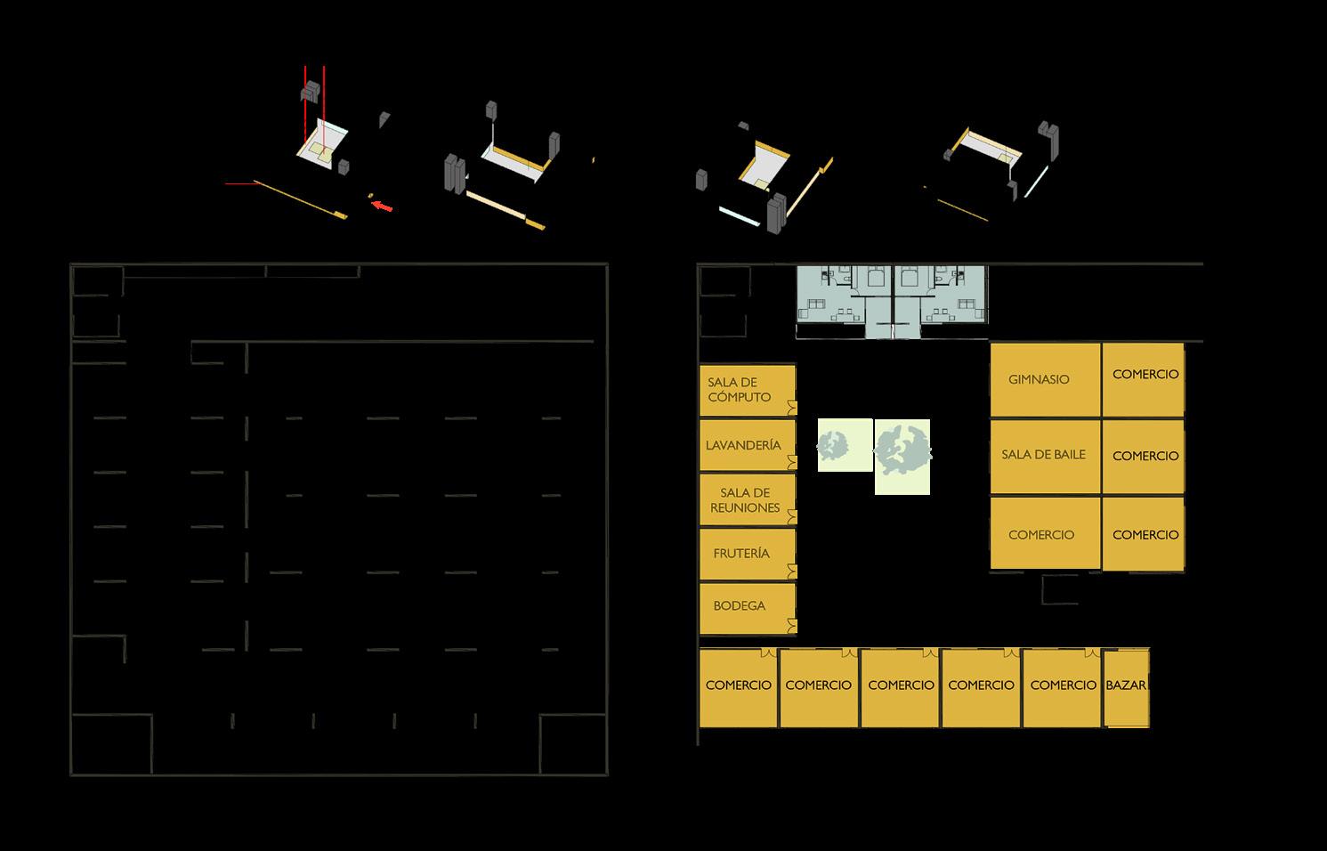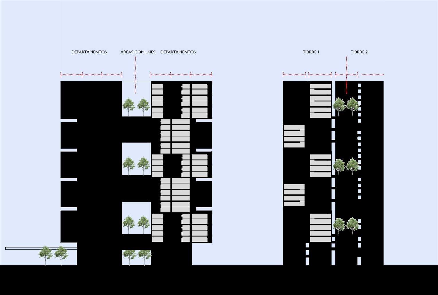 2 torres conectadas por areas de servicio publica, otorgando terrazas publicas a la ciudad.