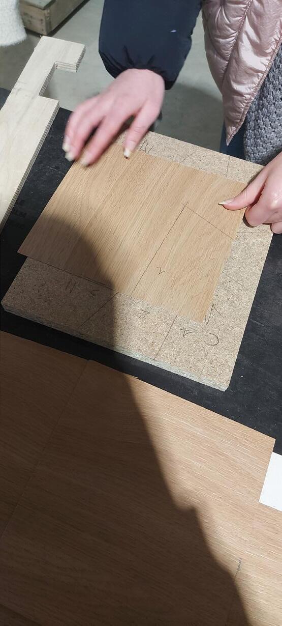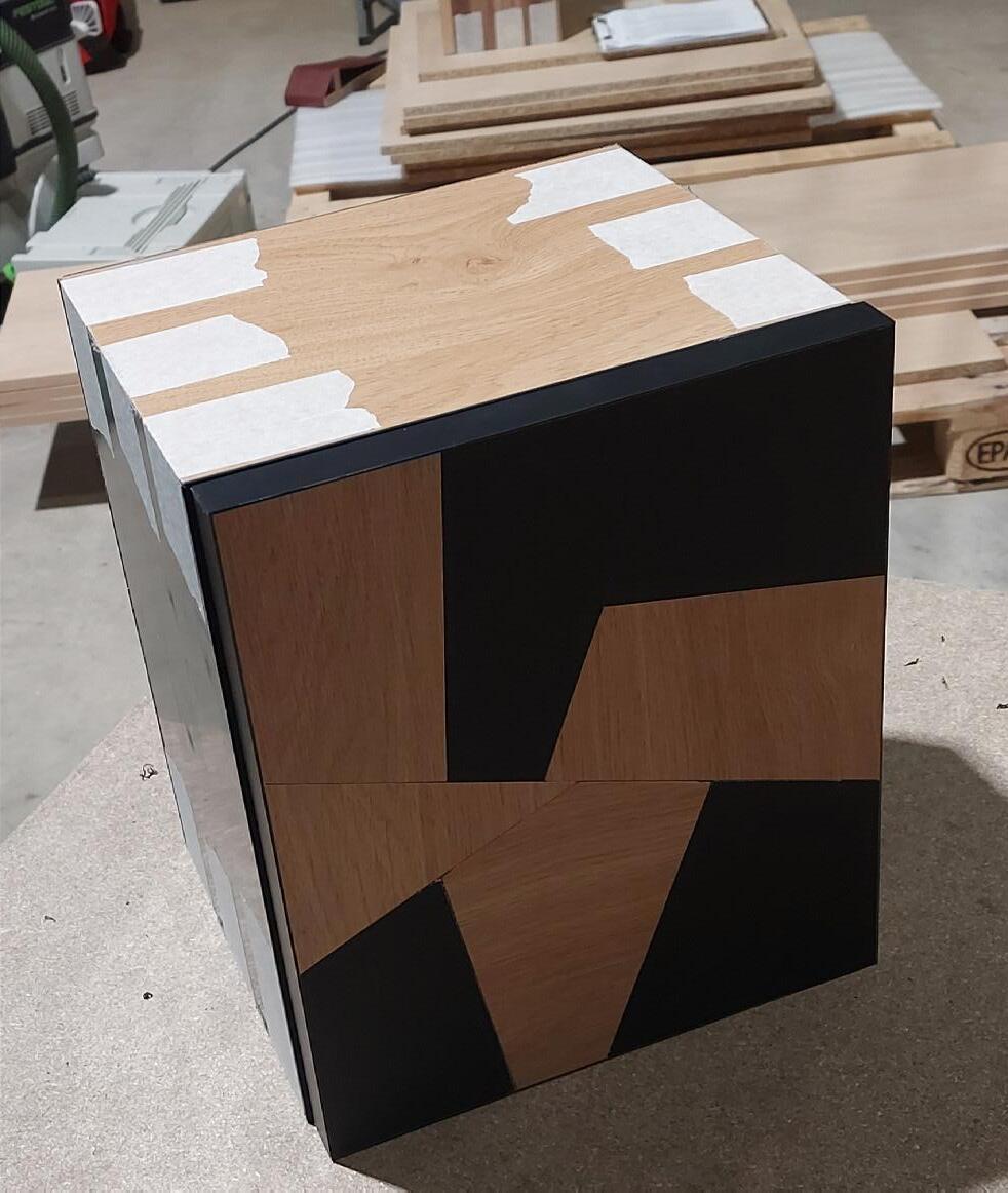 Construction d’un petit caisson en bois : conceptions 2D et 3D (découpe des planches, collage du mélaminé, charnières).