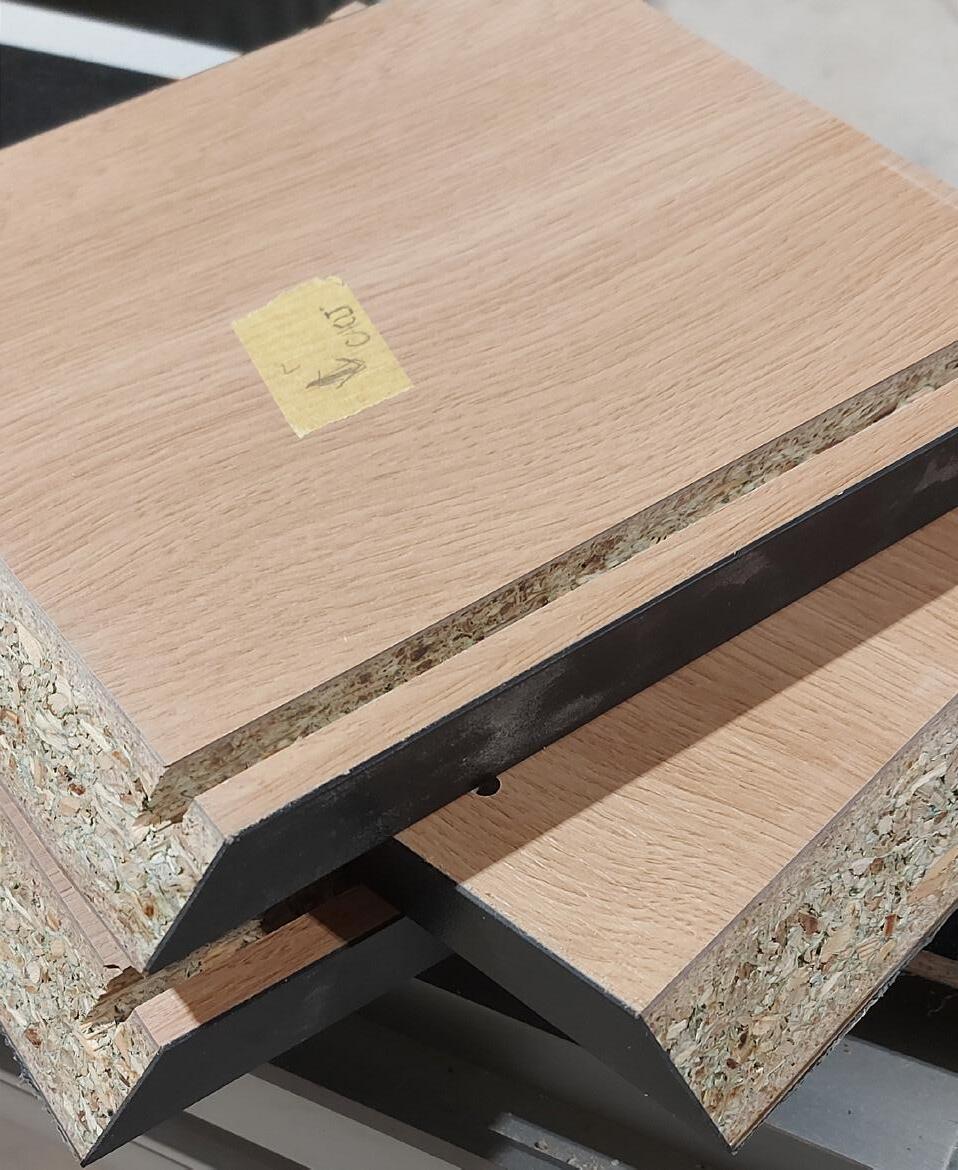 Coupes à 45° des panneaux en bois et du stratifié vert épaisseur = 2 cm