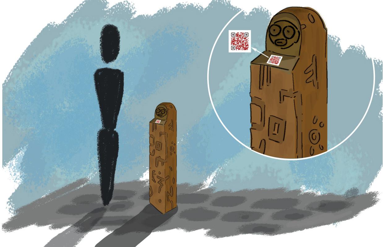 Insertion du totem “Les Adornos de la rivière rouge”.