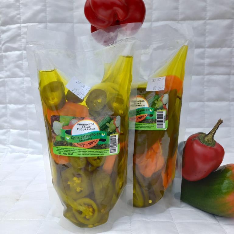 El paquete es de 500 gramos y es un chile jalapeño en vinagre