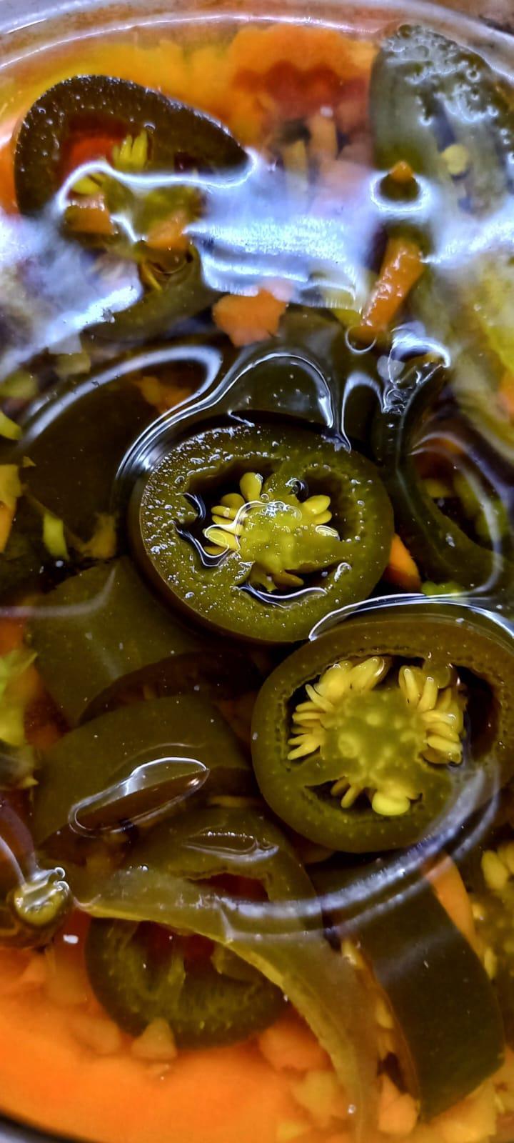 El paquete es de 500 gramos y es un chile jalapeño en vinagre